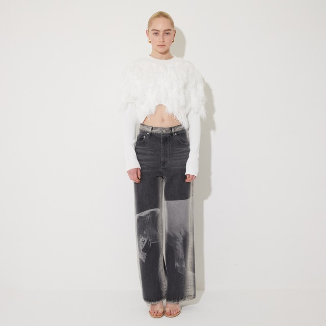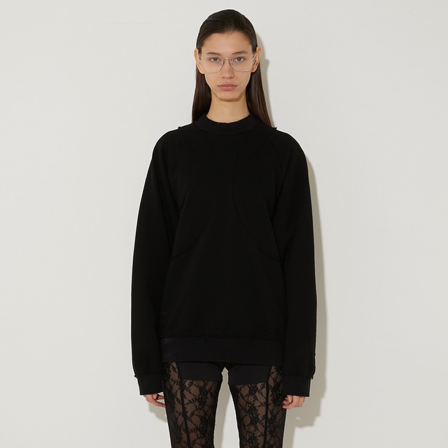 -シルケット加工を施した美しい表面感が特徴の裏毛素材 -しっかりとハリコシがあり、モードな印象が漂う裏毛素材 -センシャルなダイヤチュールを組み合わせることで意外性を表現 しっかりとフォルムの出る印象的なシルエット。 大きめなアームホールなど、メンズスウェットの様なざっくりとしたシルエットと相反し、バックスタイルはチュールで大きく透けた大胆なカッティング。 身頃全体を包むカービーなシームは全て断ち切りにしディテールが際立ちます。有機的なラインを表現しています。 本体 コットン100% サイズFREE 着丈68cm 身幅63cm 裄丈89.5cm 手洗い可 原産地 日本 No. 24010102