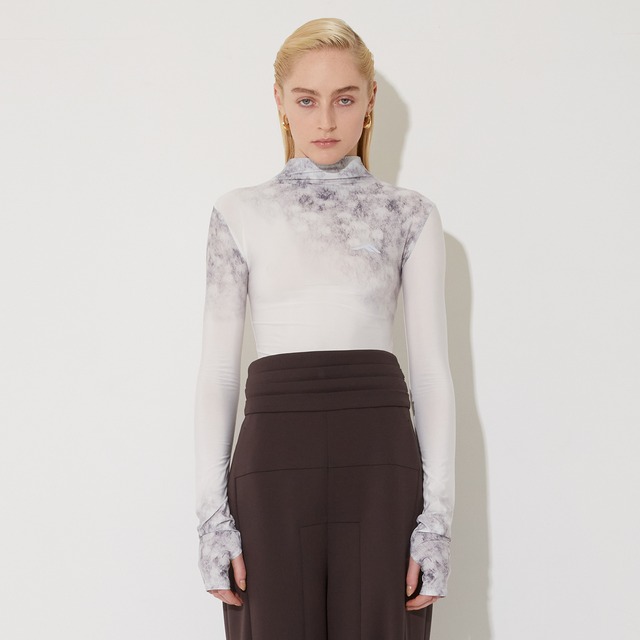 プリント スキン トップス ホワイト ブランドの頭文字”F”がプリントされたスキントップス。 リフレクタープリントがモードな印象です。 袖は長めの設定で、フィンガーホールに親指を通すと手の甲まで覆われるデザインです。 ホワイトは、馬の芦毛をイメージしたプリントを施しています。 ネックや袖口からプリント柄を覗かせるレイヤードスタイルのおすすめです。 ハイゲージでとても伸縮性があり、肌触りの良いしなや かなジャージー素材。 マットな質感でスポーティになり過ぎないシックな印象です。 ポリエステル 85% ポリウレタン 15% SIZE/F 着丈60cm 身幅37cm 袖丈73cm 原産地 中国 No. 25020103 ※こちらの品番は、ピンクとブラックもございます。
