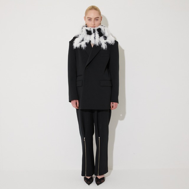 フラッフィー マルチ ビスチェ ブラック べアトップとして着用することはもちろん、首元に巻いていただきスヌードのような着方など、様々なアレンジが可能なマルチパーツです。 フロントにファスナーを取り付けているため、首元に巻く際スリットとして開けていただきますと、肩まで覆われるシルエットでご着用いただけます。 膨らみとボリューム感のあるポリエステル糸をベースに数種類の意匠糸を組み合わせたカットジャカードニットを使用。 ふわふわとしたボリュームがインパクトのあるニ ット素材です。 ポリエステル 91% ナイロン 9% サイズ:FREE 着丈35cm 身幅34cm 原産地 中国 No. 25020702 ※こちらの品番は、ピンクとホワイトもございます。