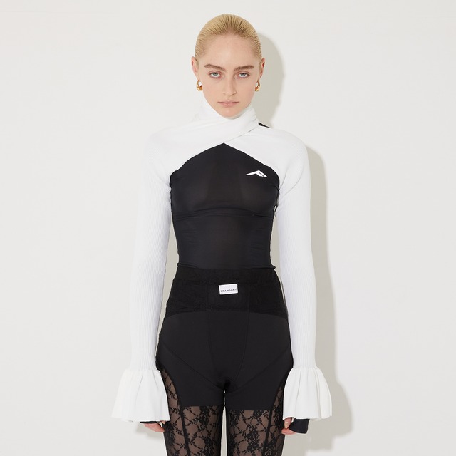 ツイストニットボレロ ブラック 袖を通し、フロント首元でクロスさせ後ろのホックで留 めるショートボレロです。 ホックは三段階調整が可能。 ビスチェやタンクトップなどインナーに合わせるだけでスタイリングの幅が広がります。 ふわりと広がる袖のシルエットも特徴的です。 吸放湿に優れたかなストレッチ素材と使用。 しなやかで肌触りと伸びがよ く、ストレスなく着用いただけます。 後ろ大胆なカッティングにはメッシュチュールを合わせることで、センシャルなアクセントを加えています。 表地 アセテート 72% ナイロン 26% ポリウレタン 2% 別布 ポリエステル 100% サイズ:FREE 着丈21cm 裾幅42cm 裄丈83.5cm 原産地 日本 No. 25020106 ※こちらの品番は、ホワイトもございます。