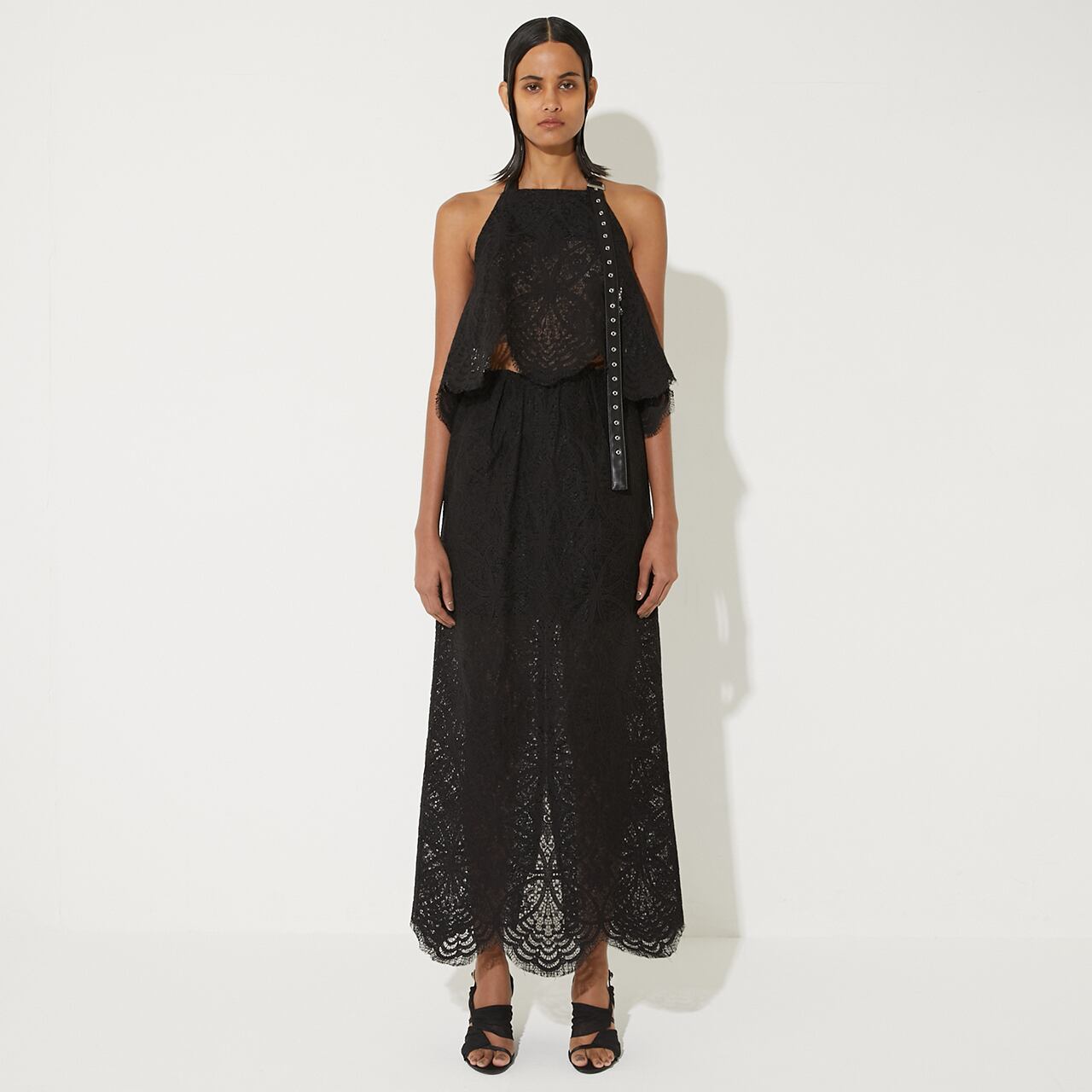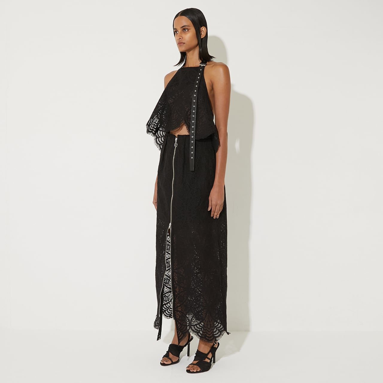深く開け、レースガードルなどボトムを見せて着用いただくとモードな印象に