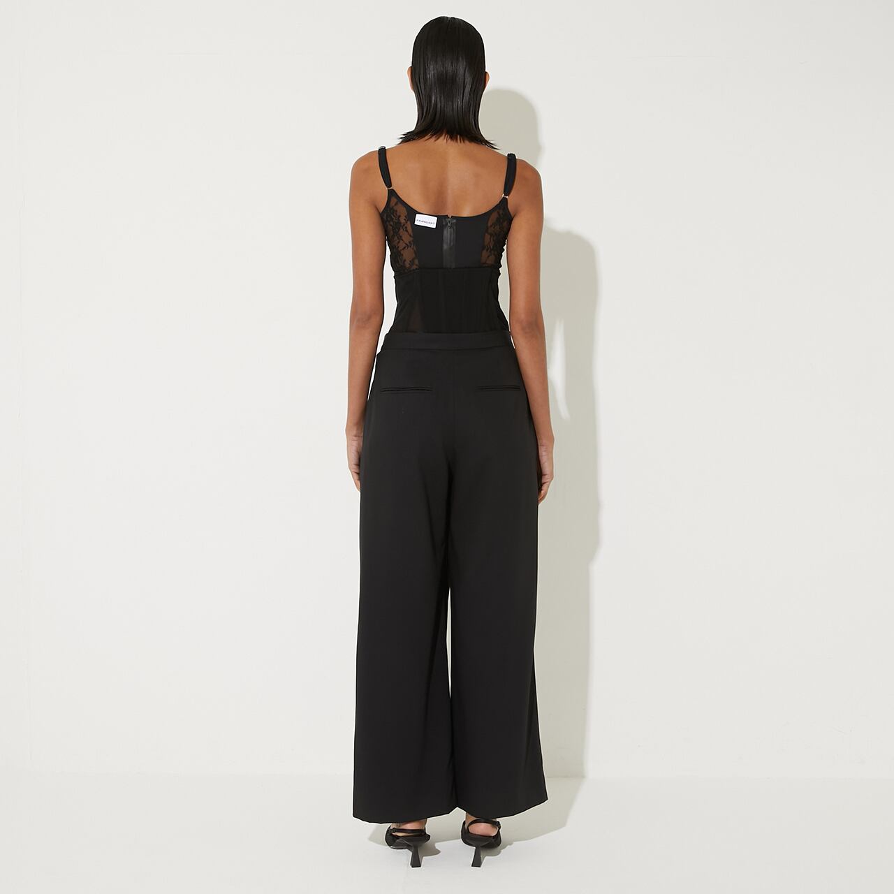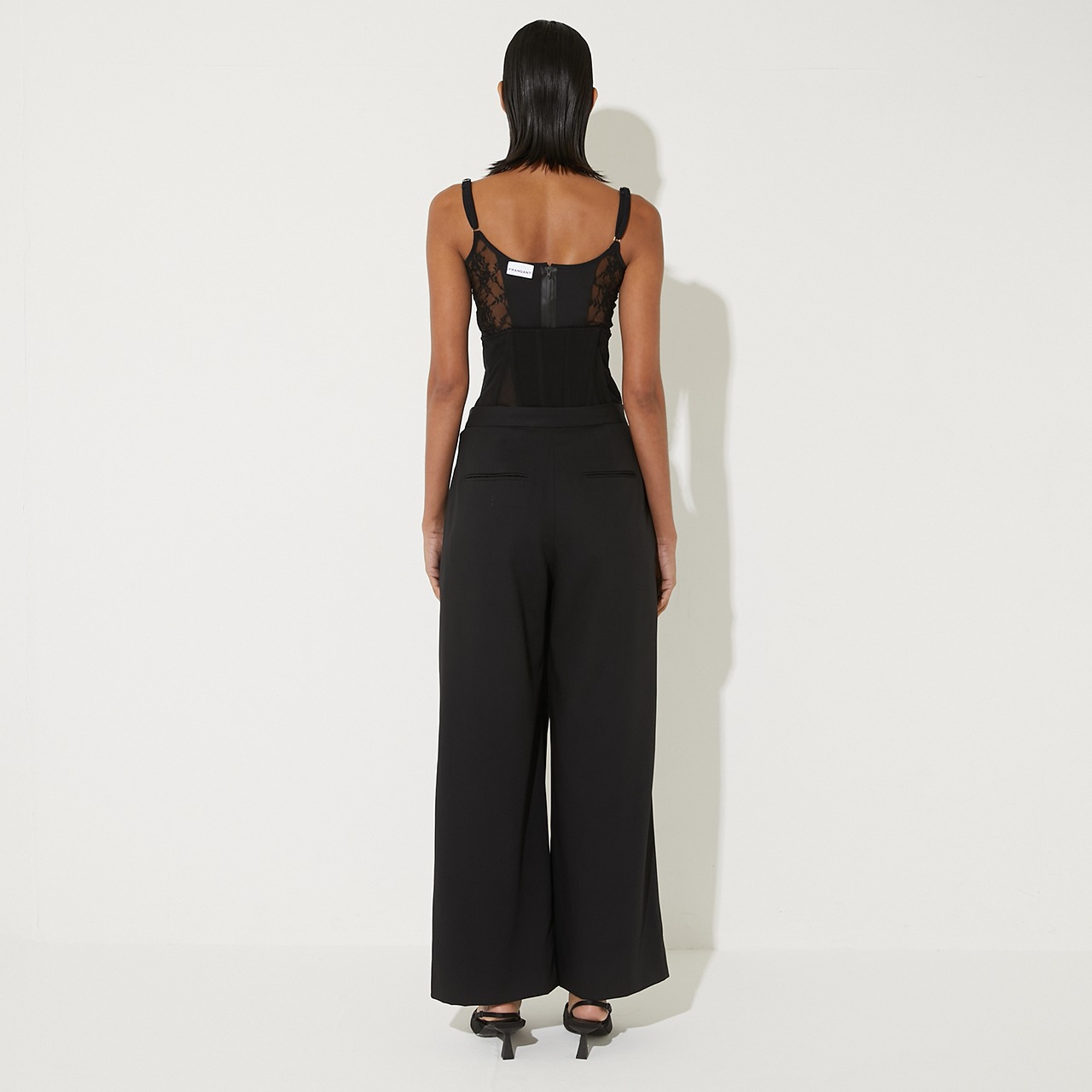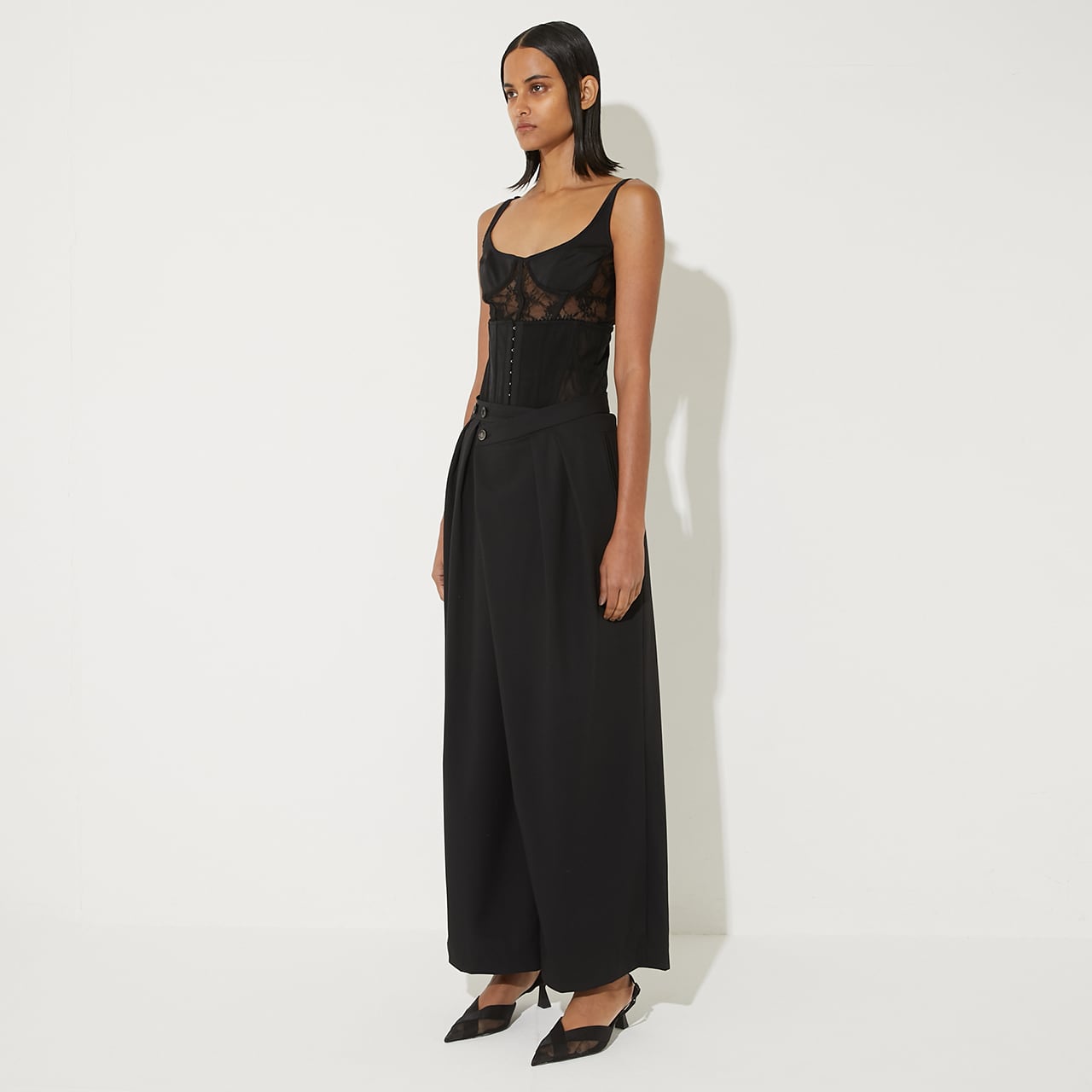マニッシュなタックパンツにコルセットを合わせたデザイン