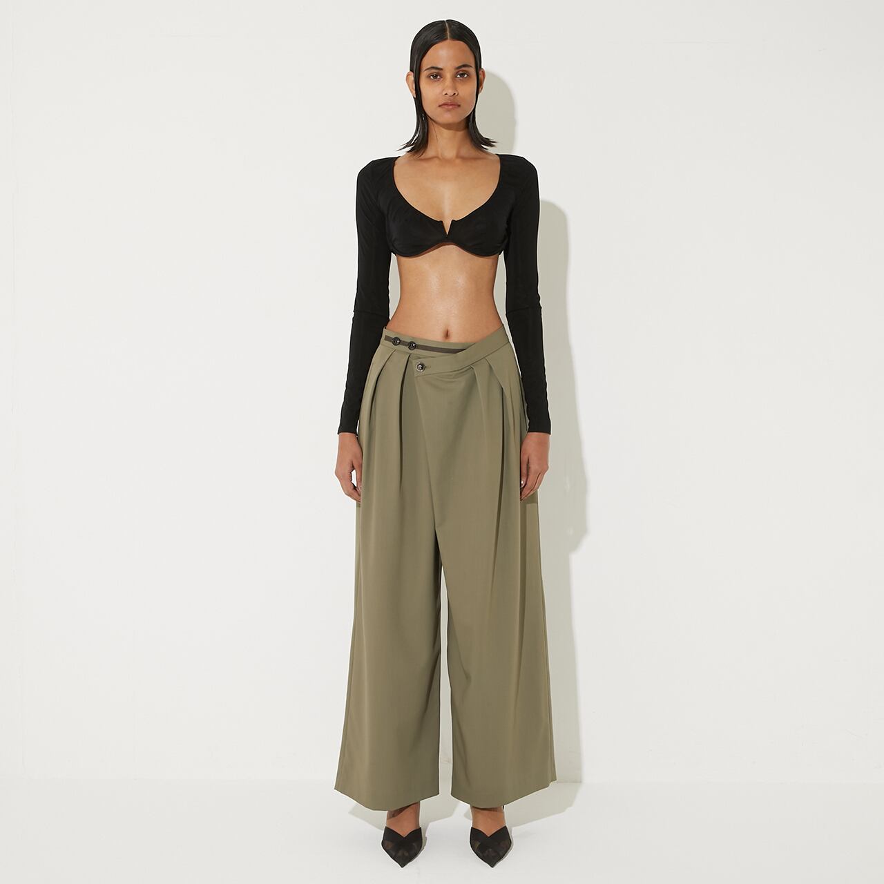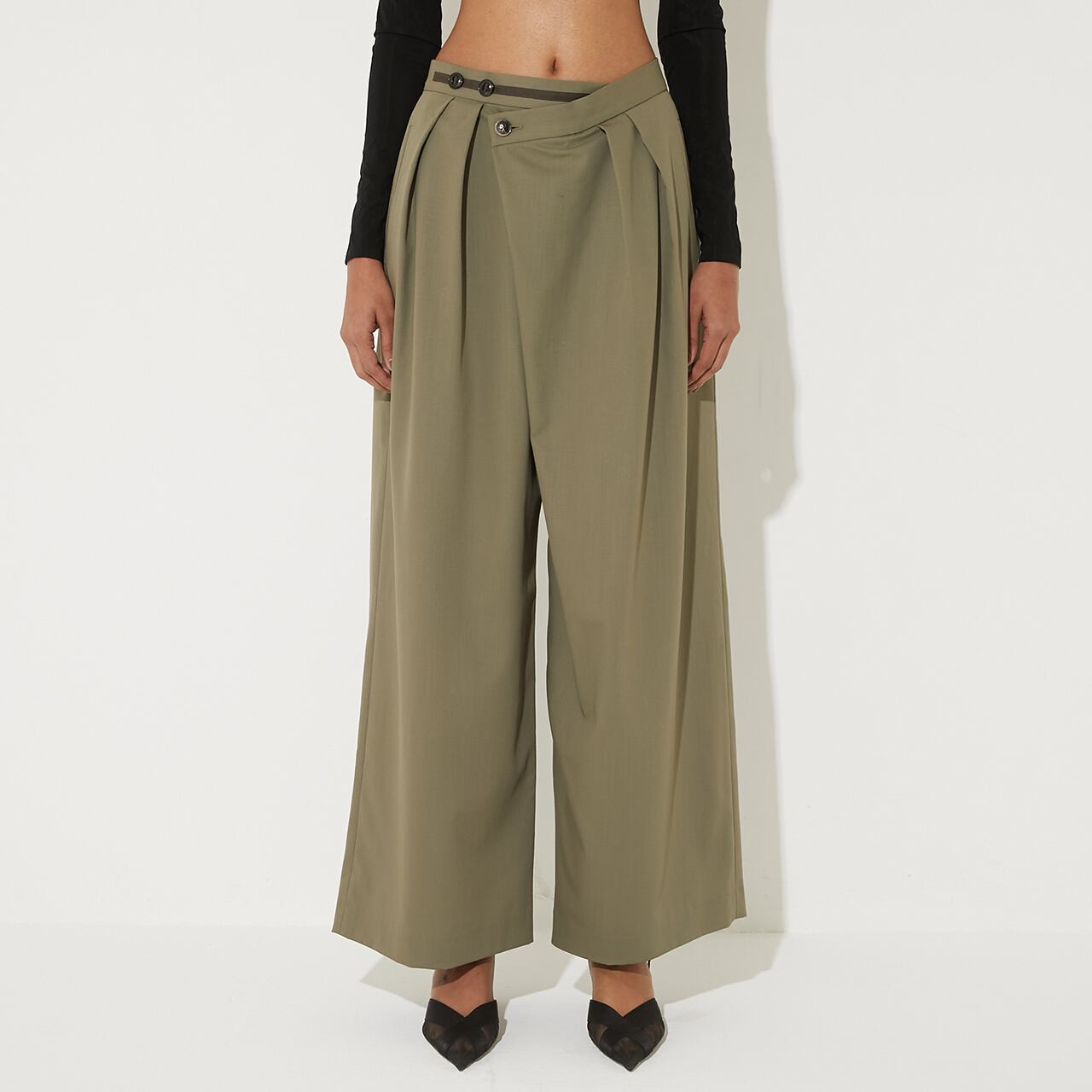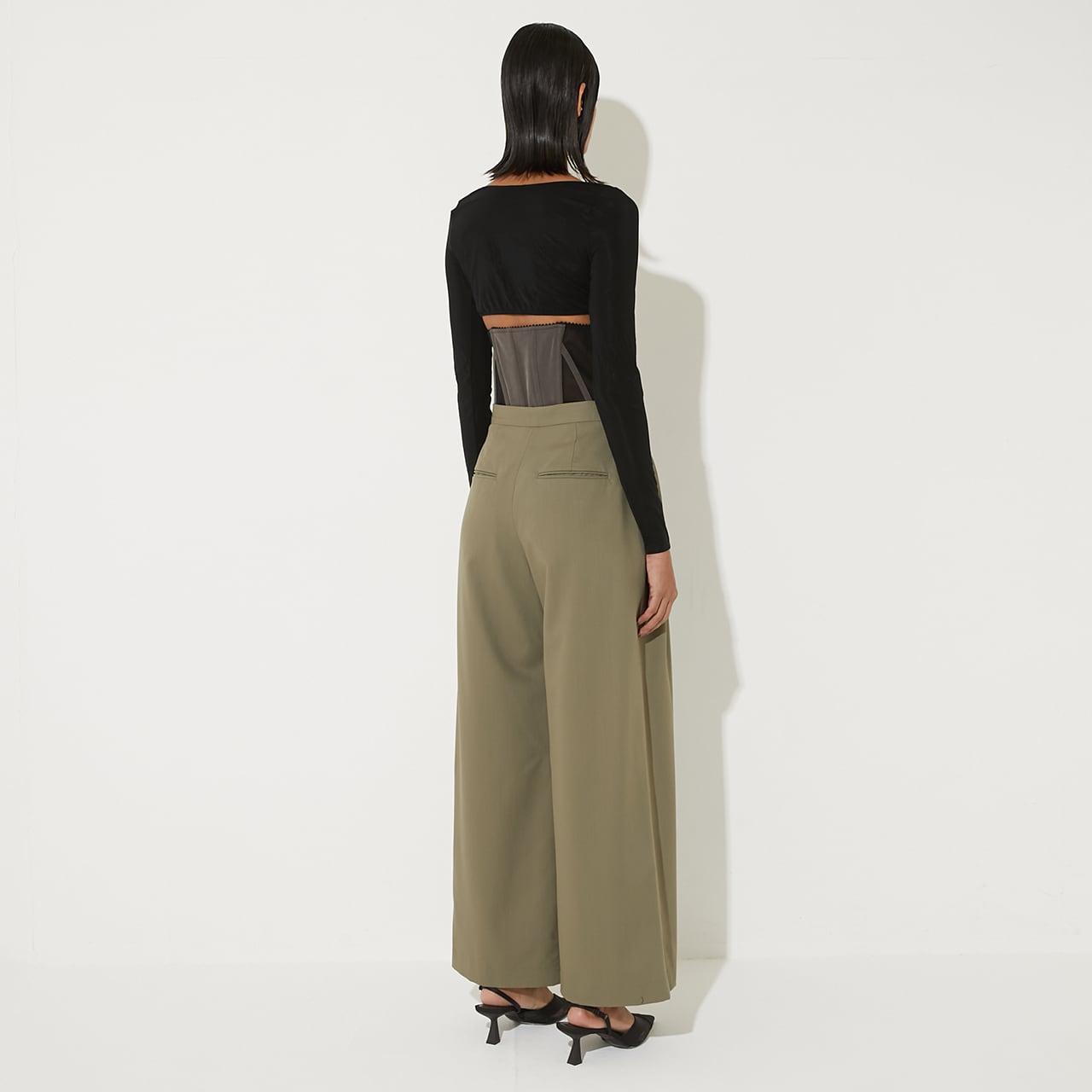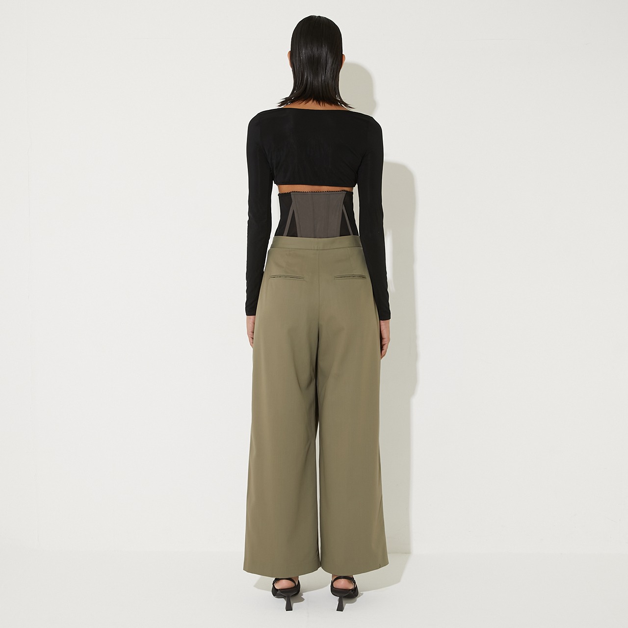 マニッシュなタックパンツにコルセットを合わせたデザイン