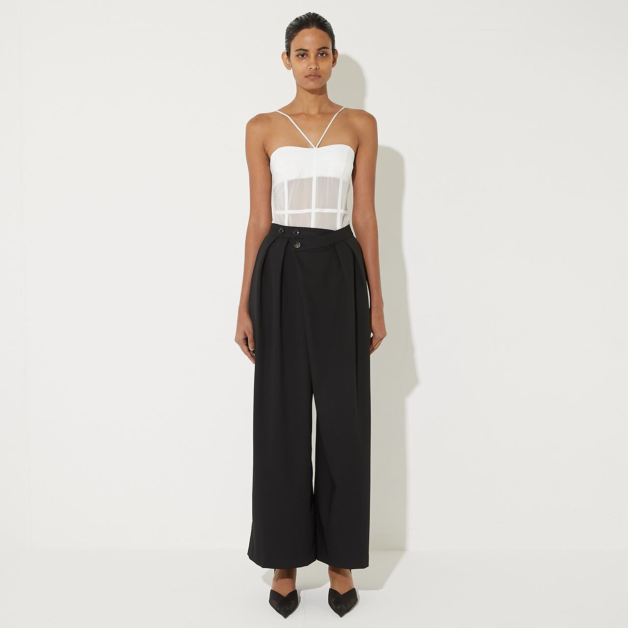 ウエスト部分をシアーチュールで大胆に透けさせた、コルセットディテールが印象的