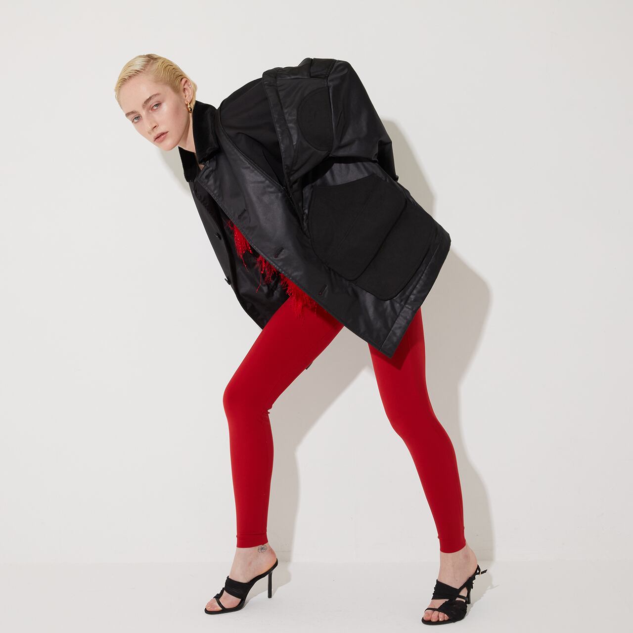 身頃に施したファスナーを開くとマチが飛び出し、シルエットが大きく変化するのが特徴です。