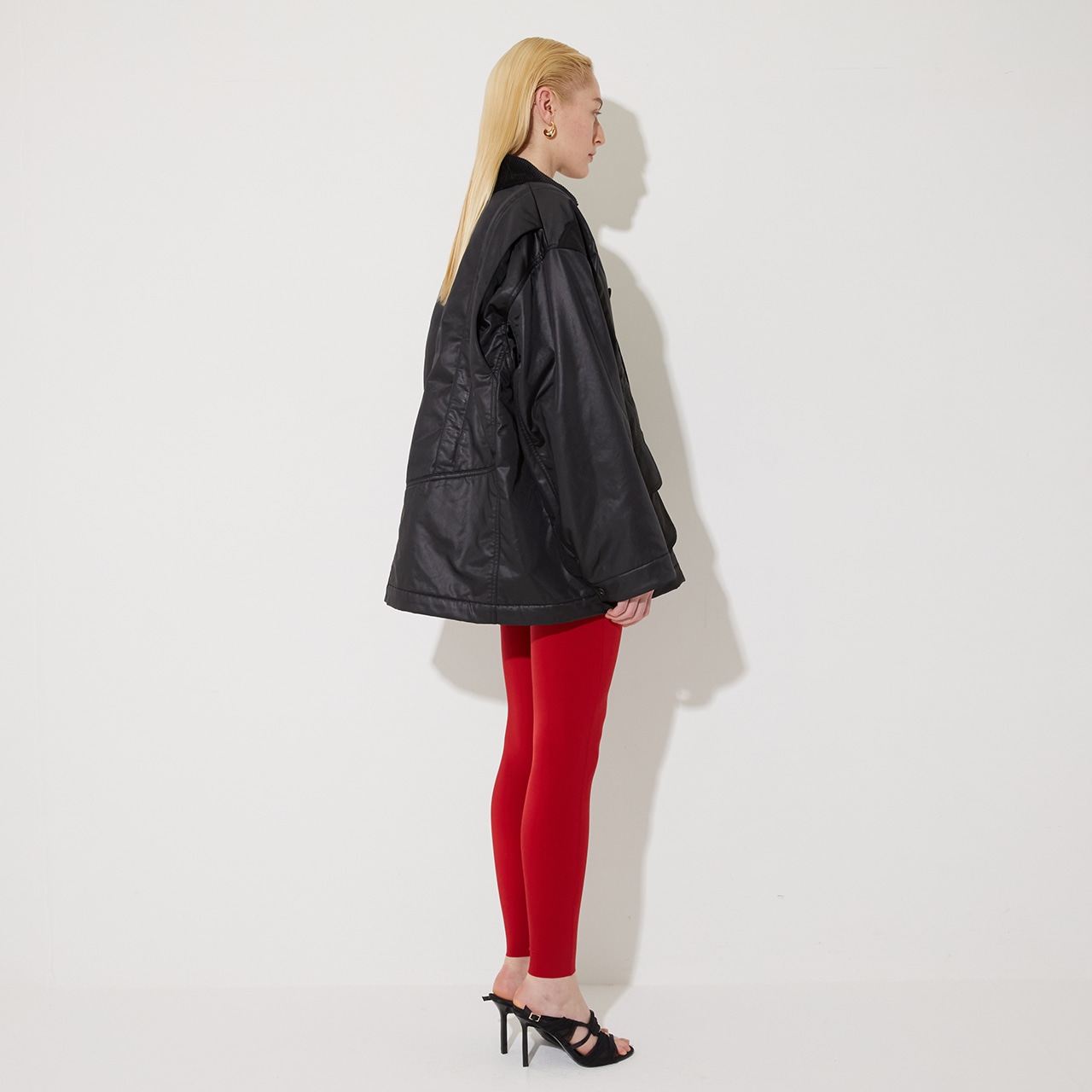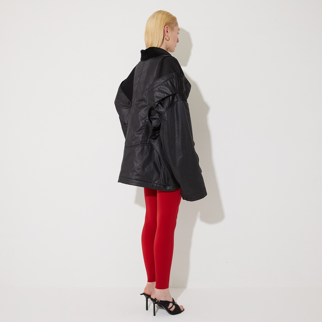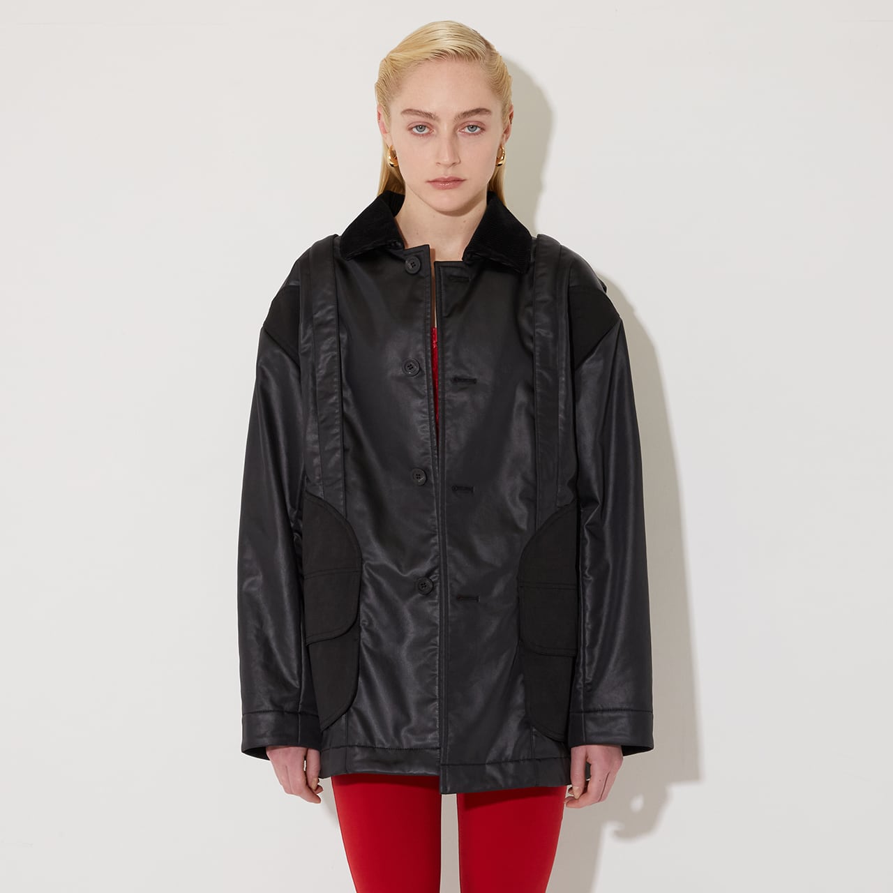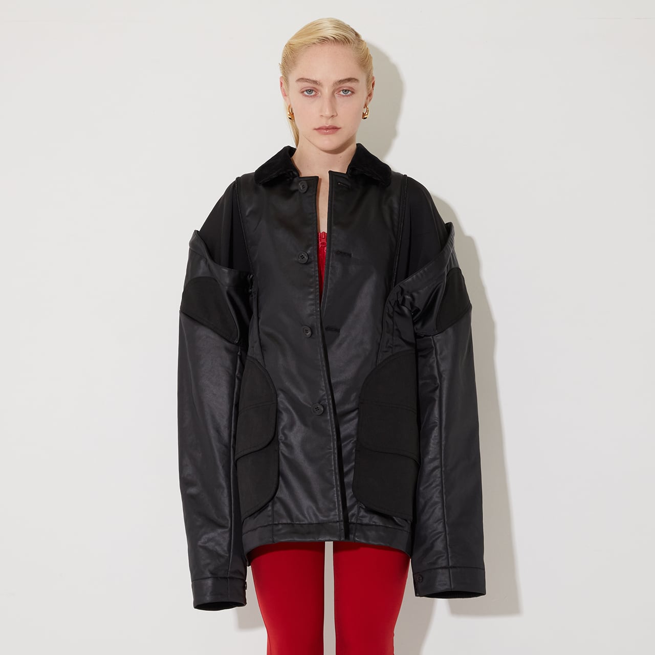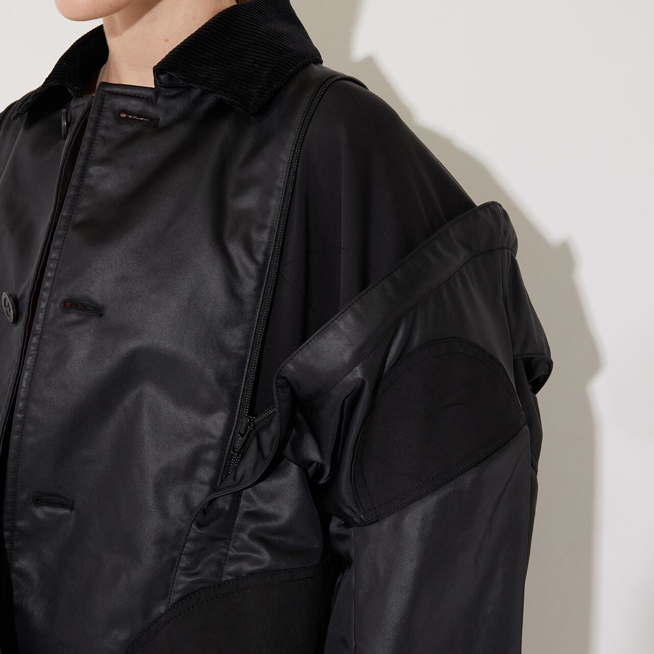 身頃はヘビーウェイトな高密度サテン生地に表面加工を施し、レザーライクに仕上げています。