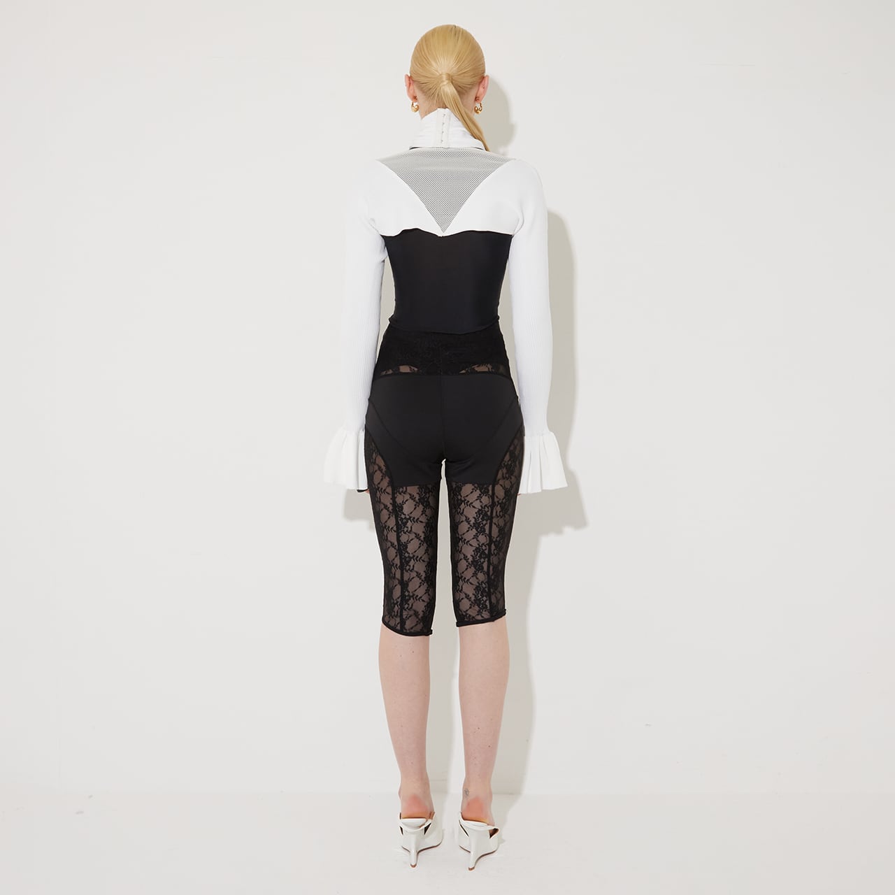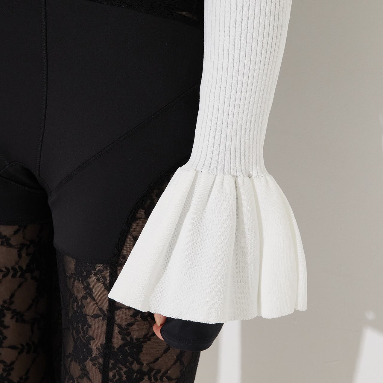 後ろ大胆なカッティングにはメッシュチュールを合わせることで、センシャルなアクセントを加えています。