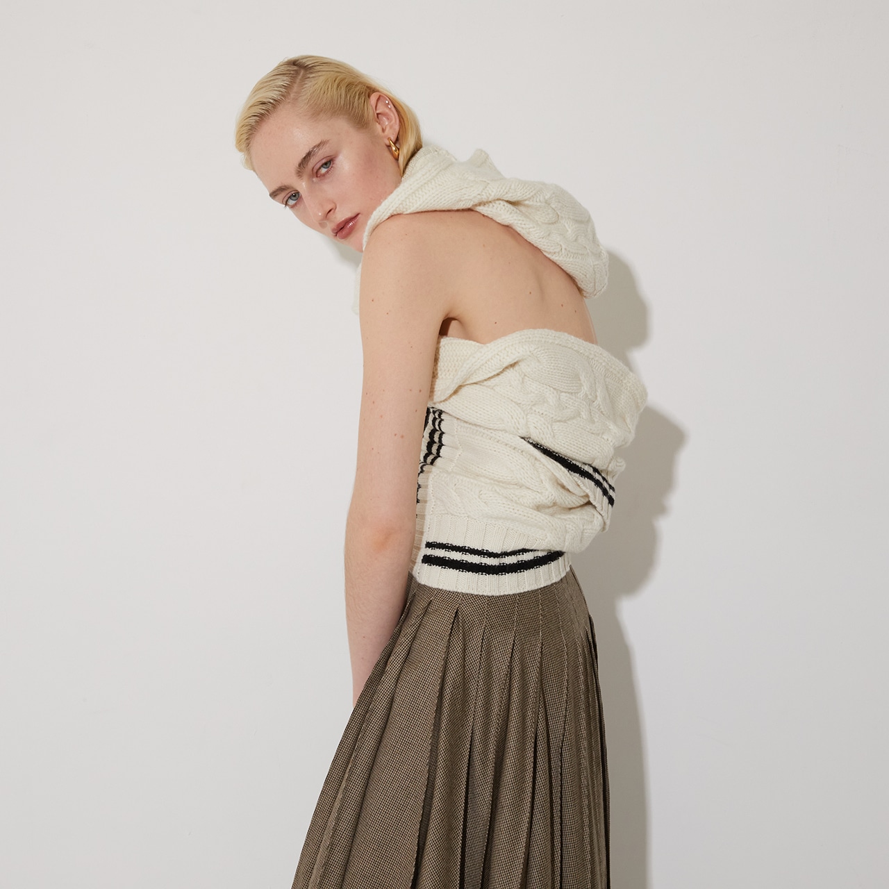 ラフに垂らして着流すスタイリングや、身体に巻き付けてホックを留めるこ とにより、トップスとしてもアレンジ着用可能です。
