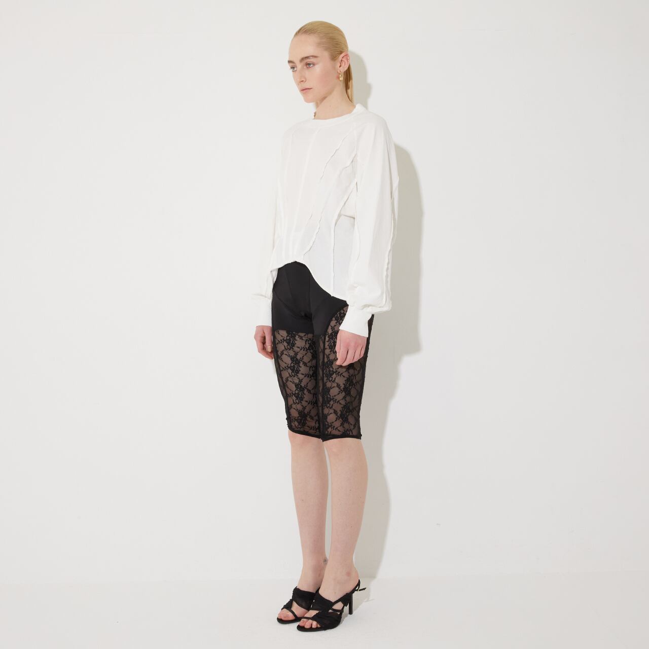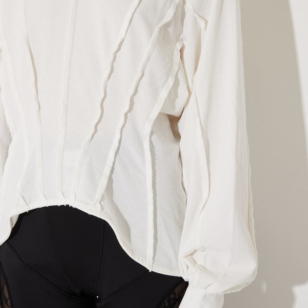 身頃に沿わせる為のシームをあえてアウトシームにし、 存在感のあるグラフィカルな表現にしています。