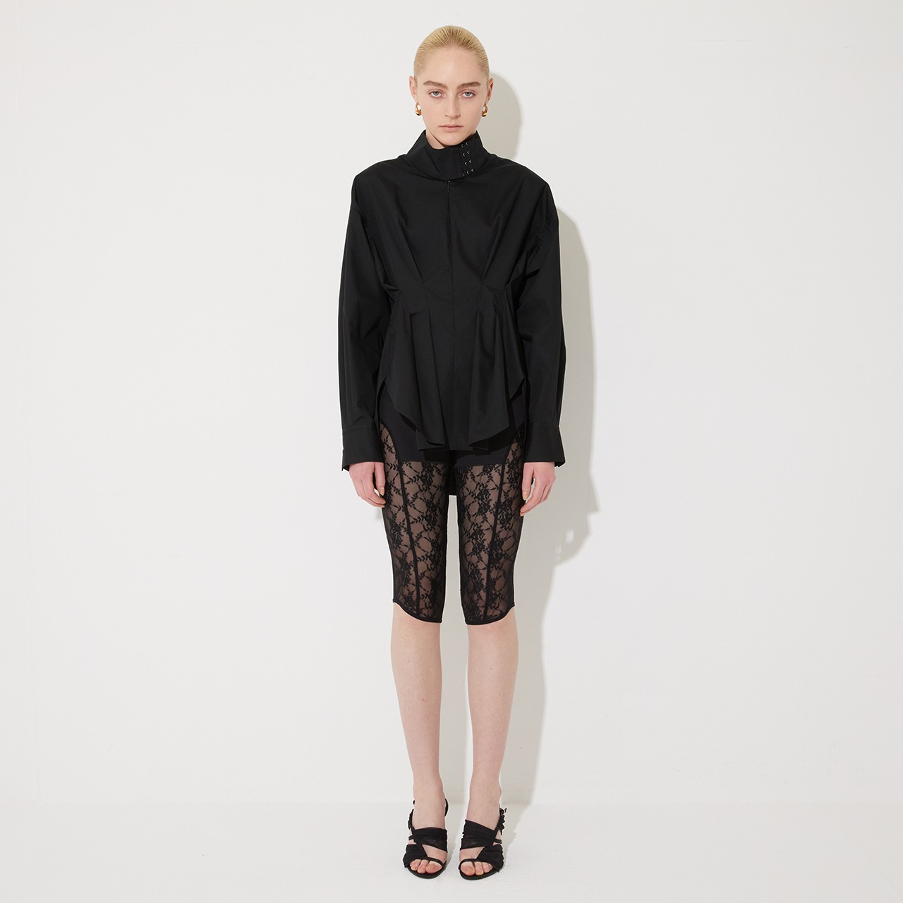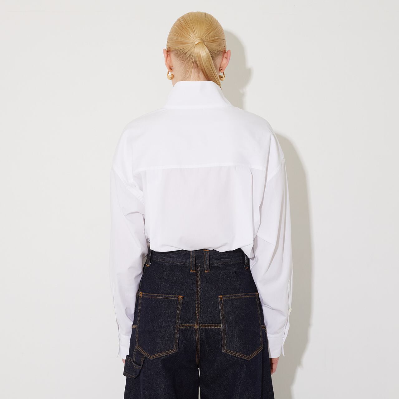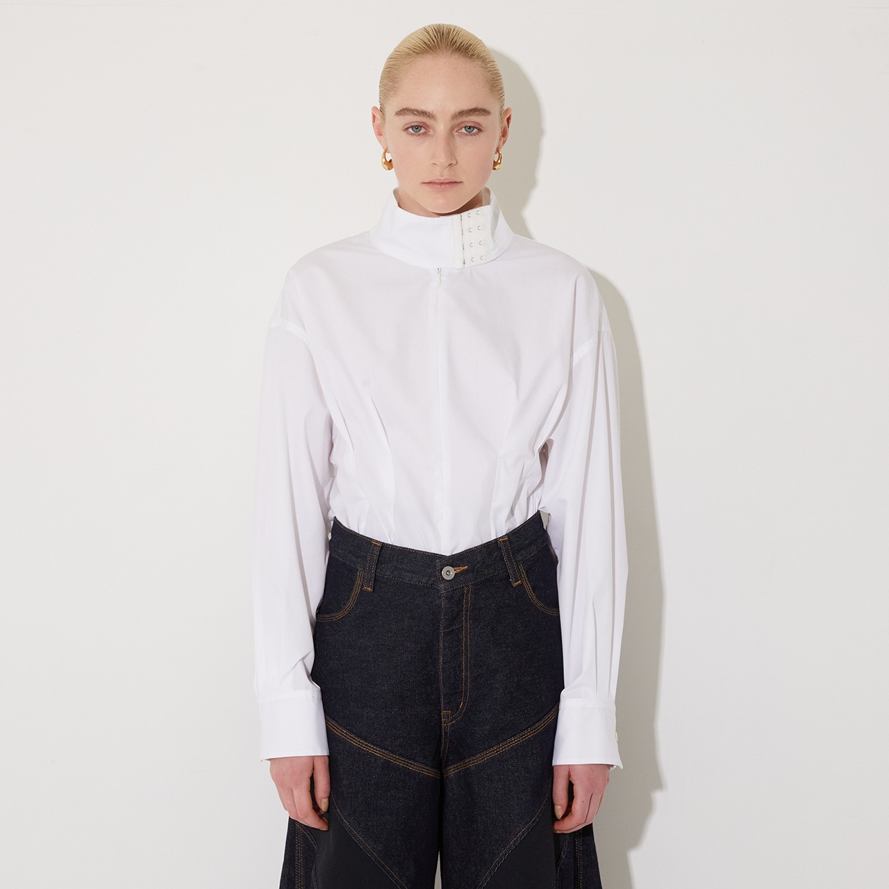 ハイネックカラーにホックアイテープをつけたことで、デザイン性だけでなく首周りのサイズ感の調整故可能です。