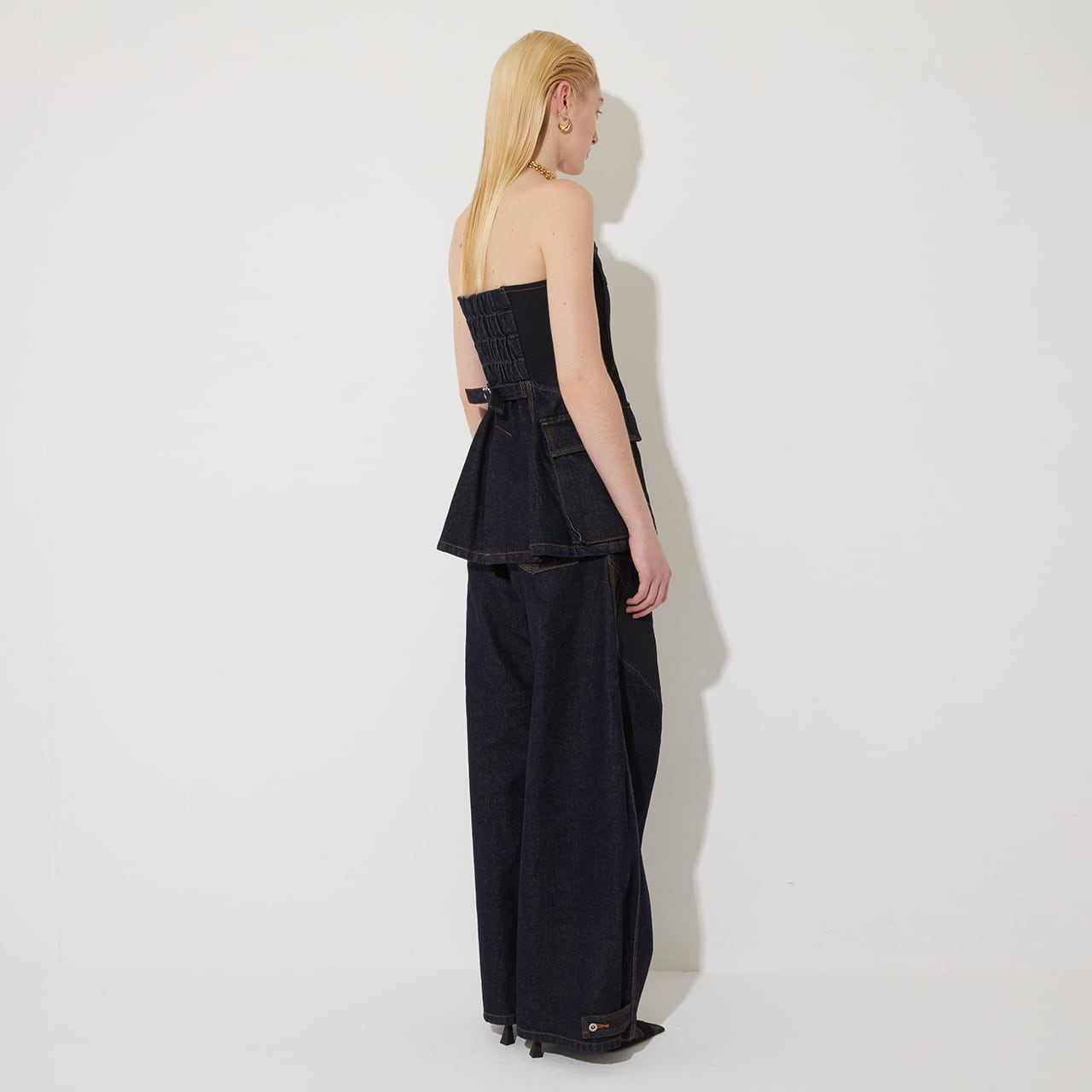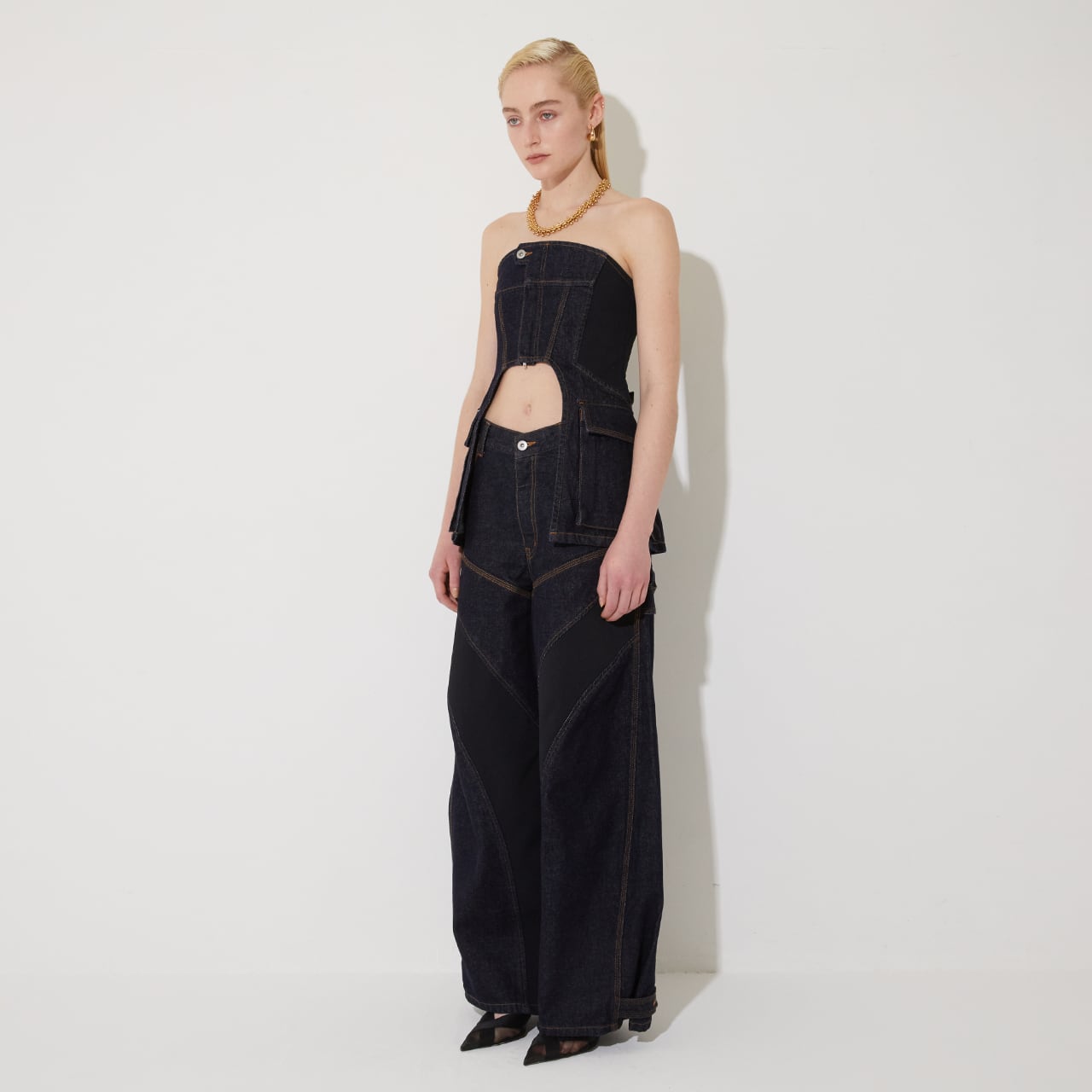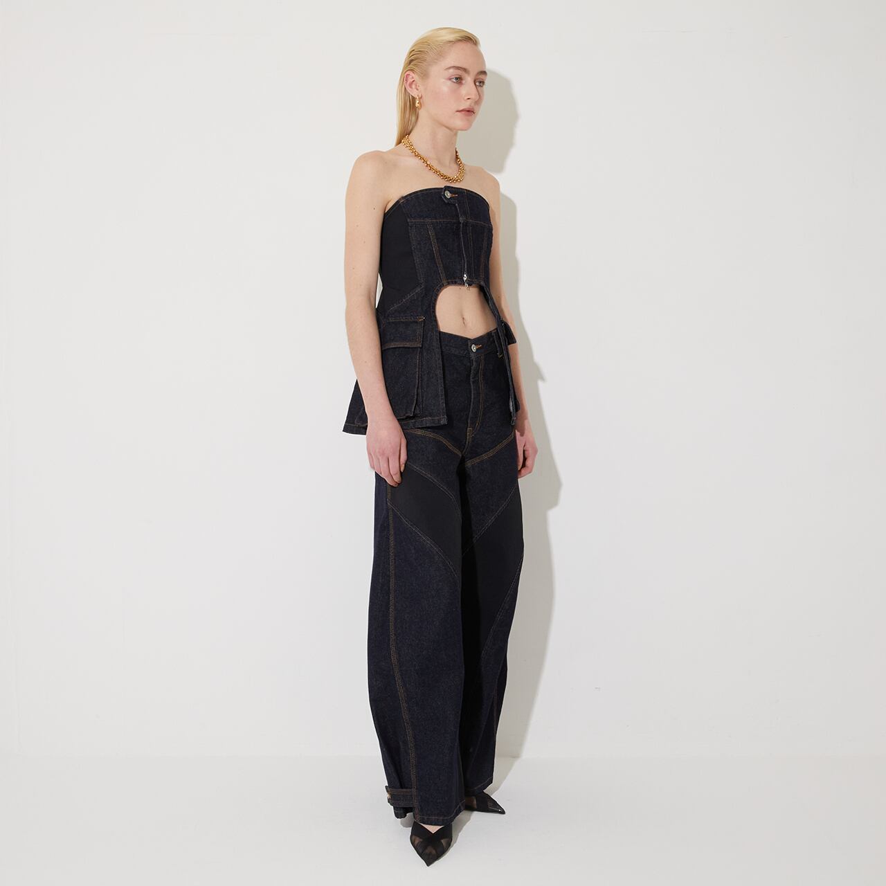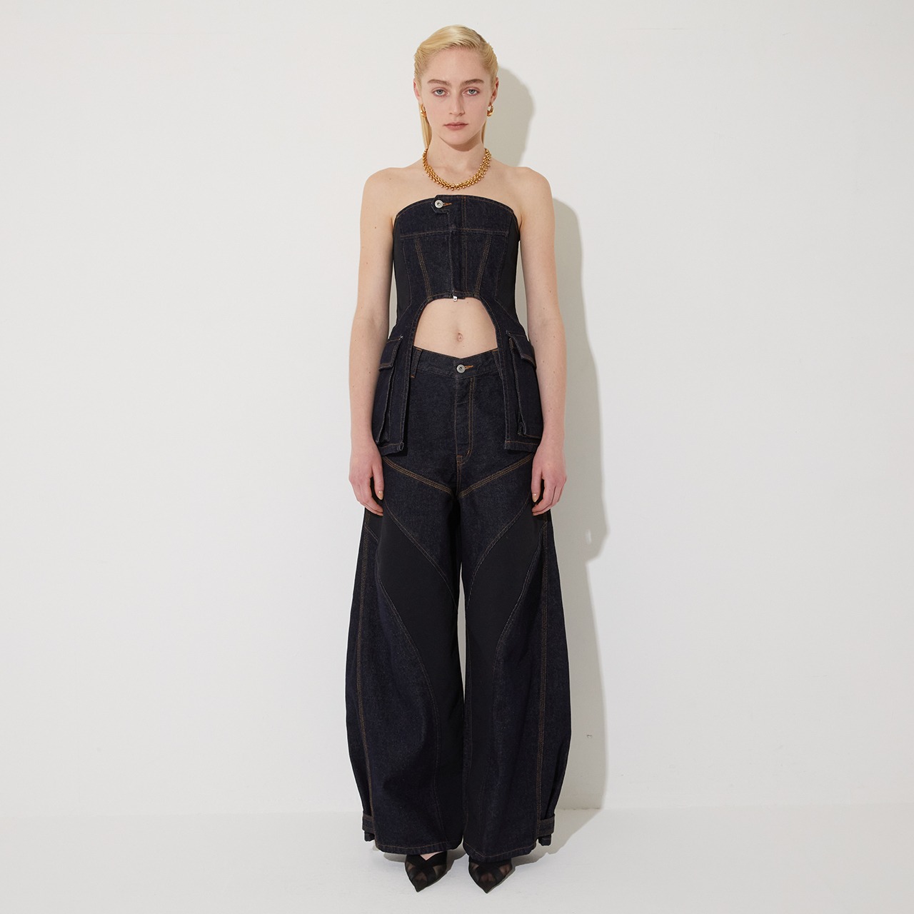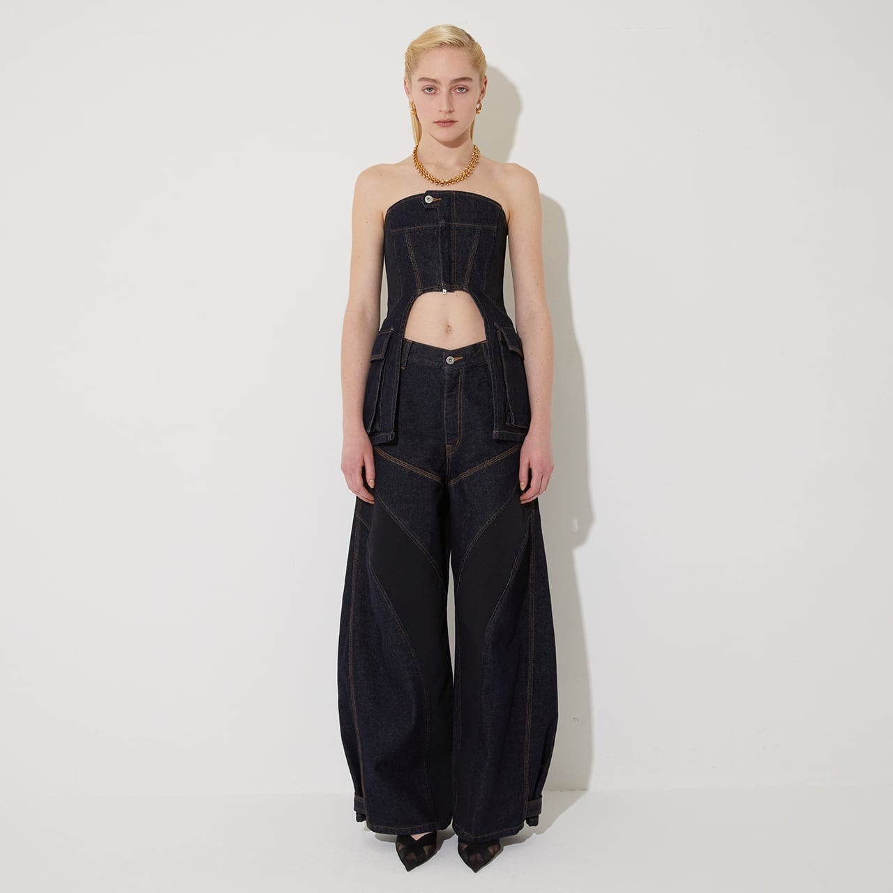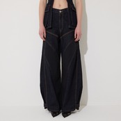 身頃に入った大胆な切り替えでユニークな 膨らみを出すことで作られた、立体的なフォルムのパンツ。