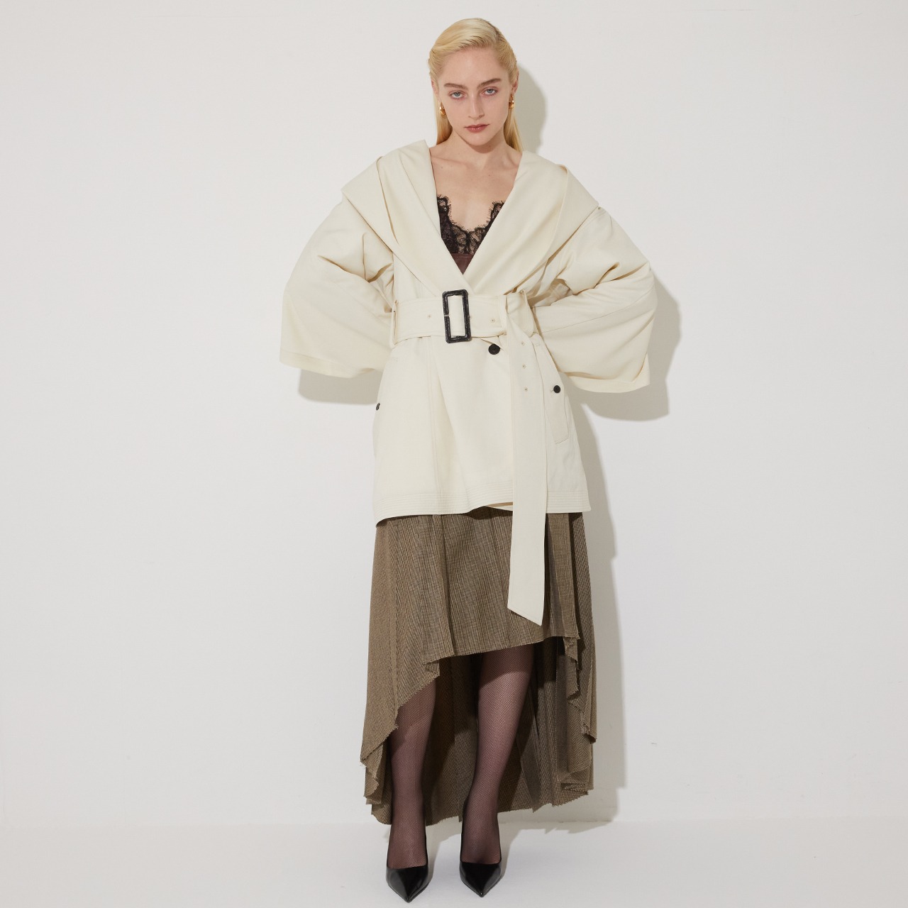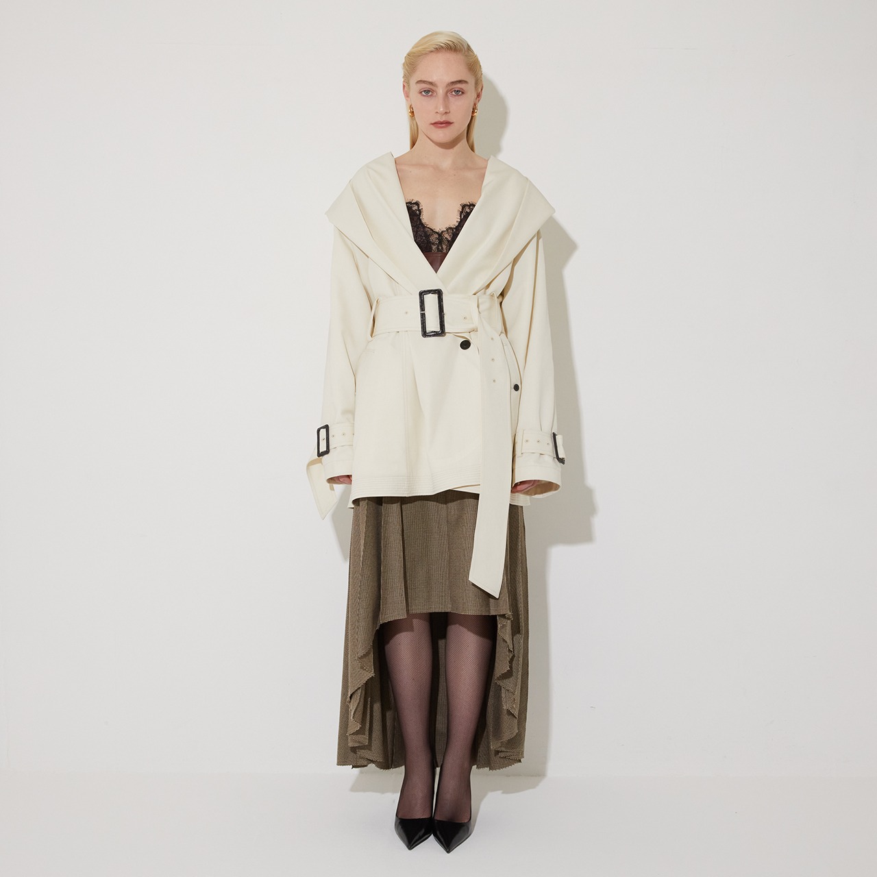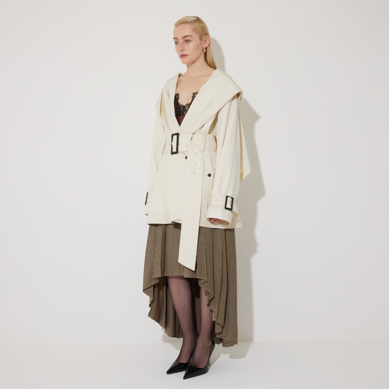 身頃から立ち上がったようなフードが特徴的なトレ ンチコート。