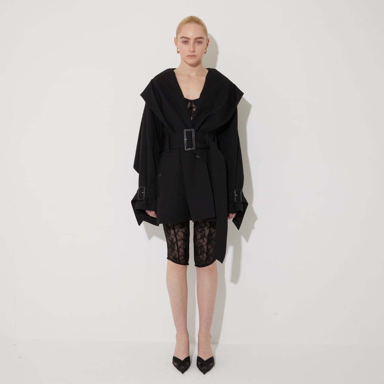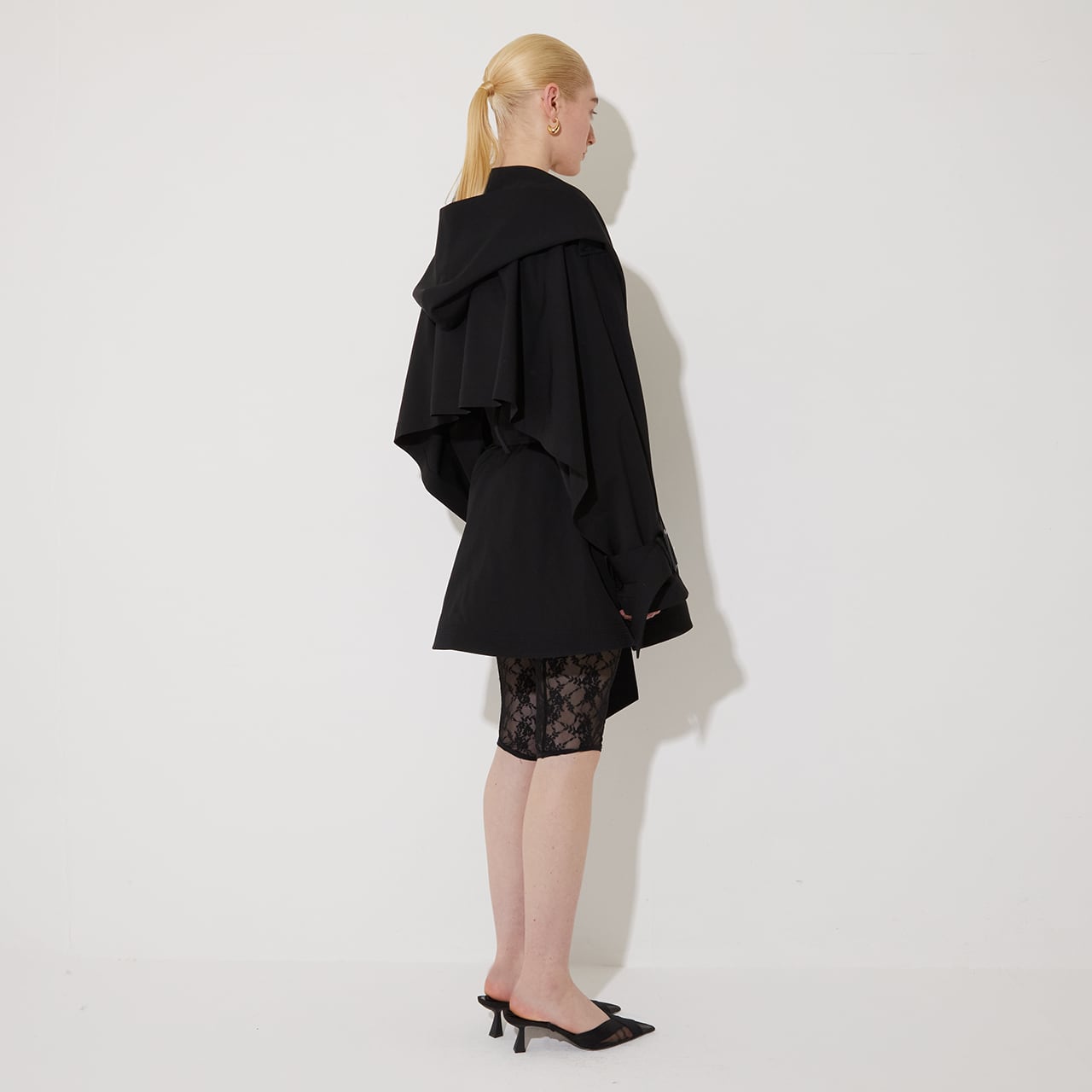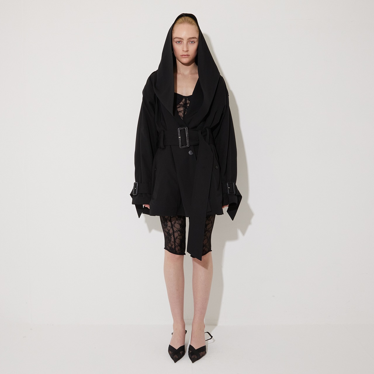 身頃から立ち上がったようなフードが特徴的なトレ ンチコート。