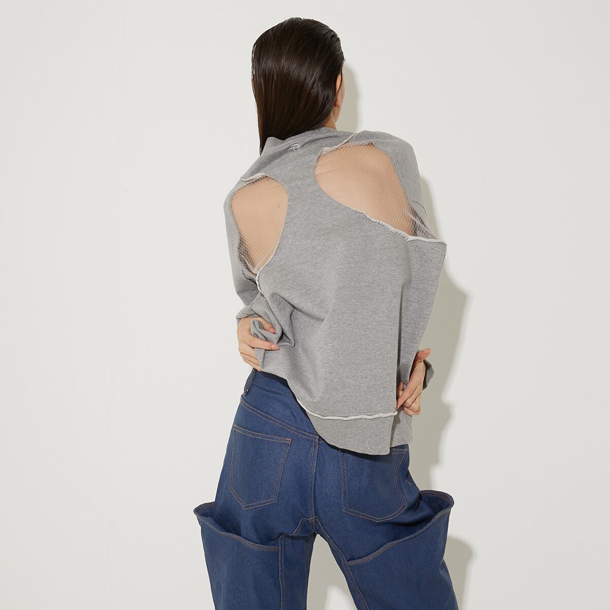 大きめなアームホールなど、メンズスウェットの様なざっくりとしたシルエットと相反し、バックスタイルはチュールで大きく透けた大胆なカッティング。