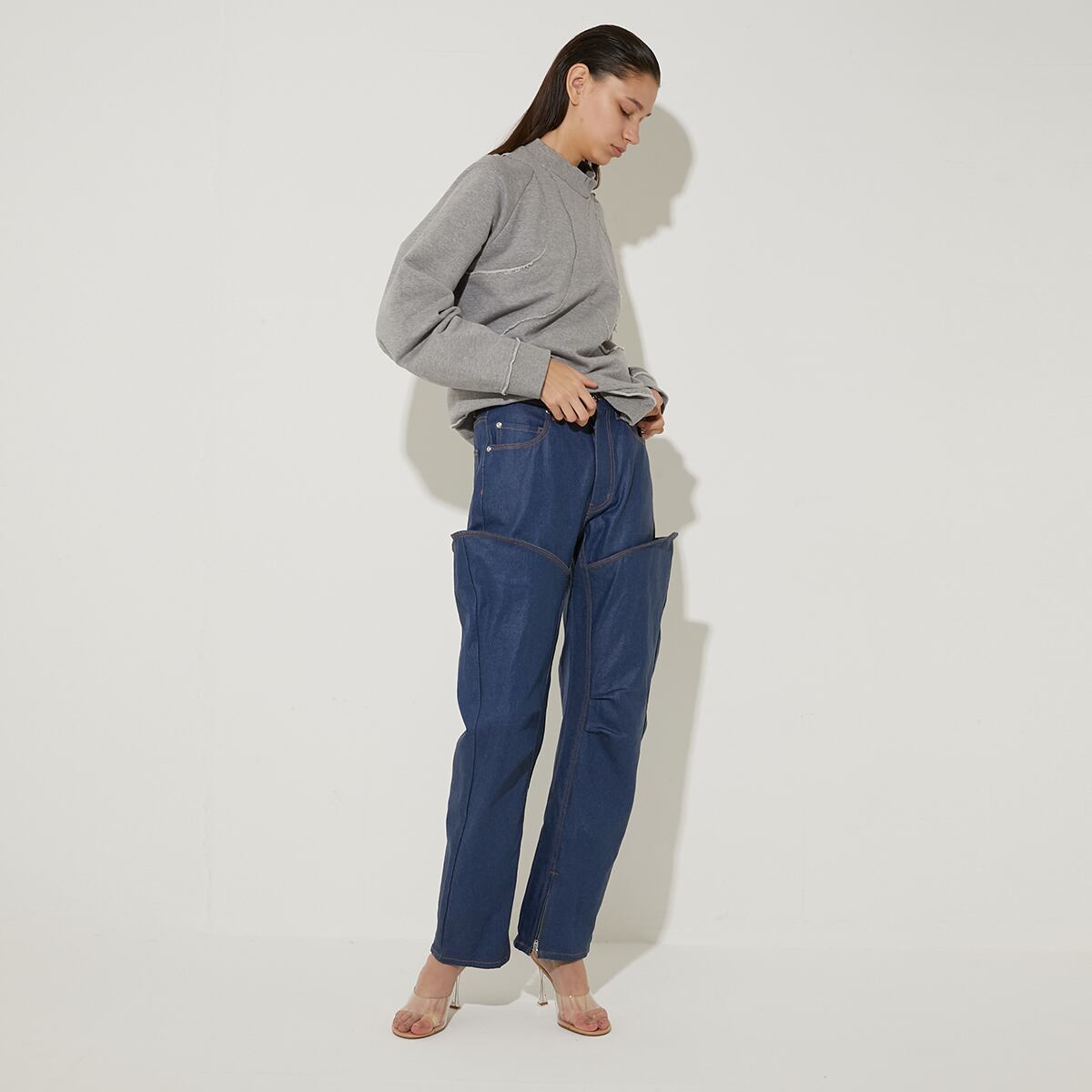 身頃全体を包むカービーなシームは全て断ち切りにしディテールが際立ちます。有機的なラインを表現しています。