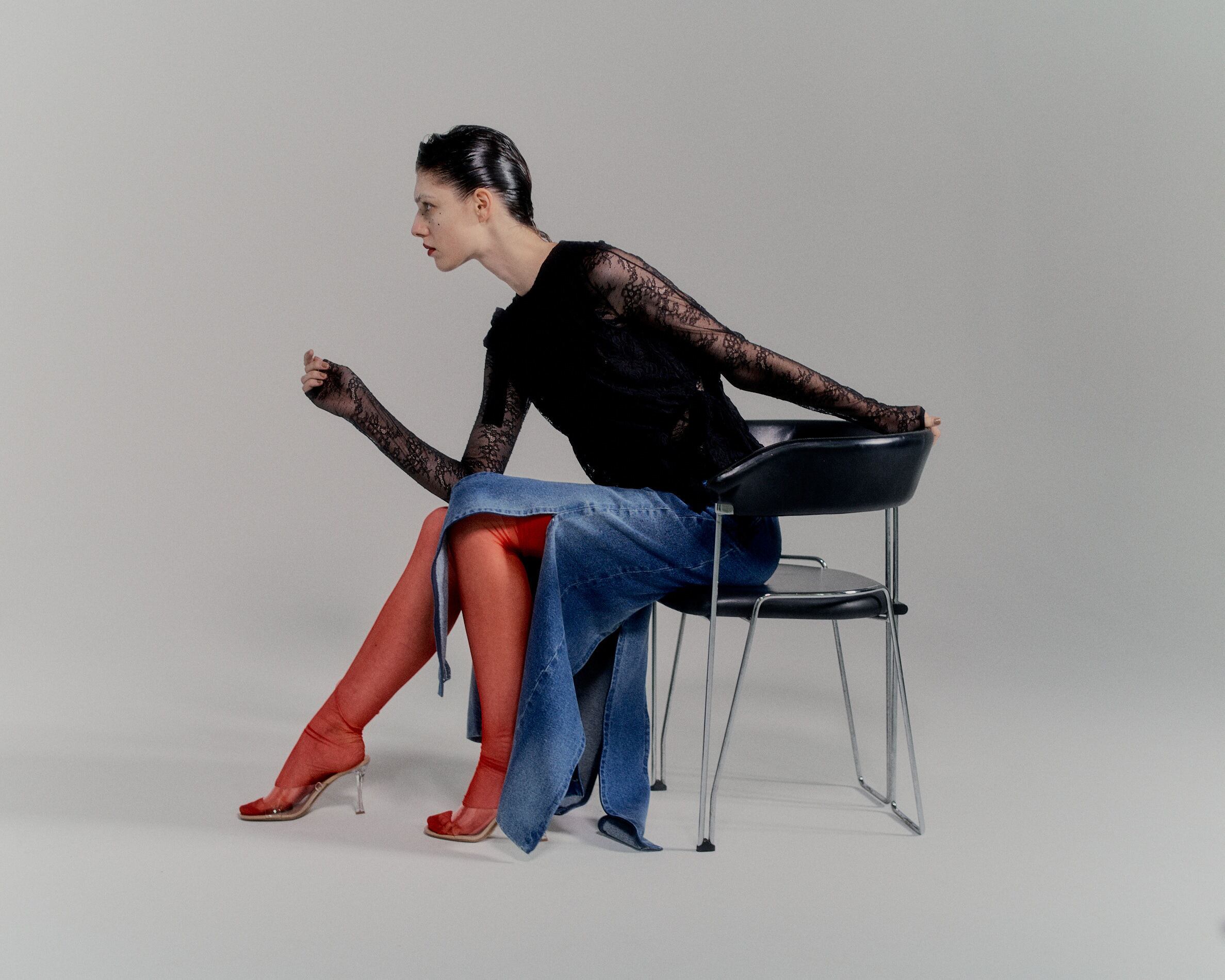スカートを包み込むカービーなシームが有機的な印象を与える。