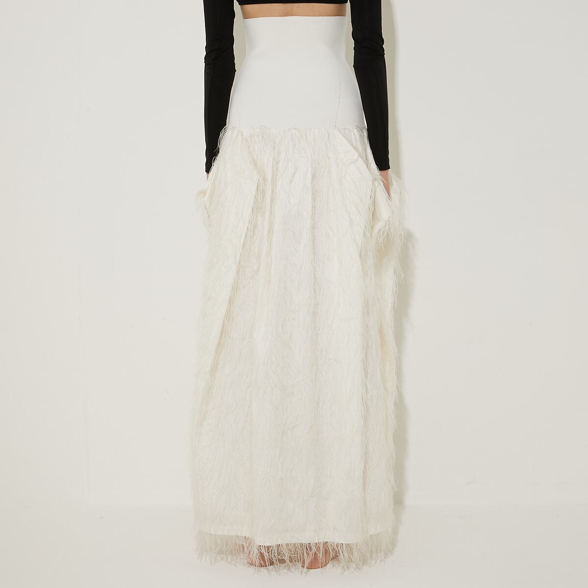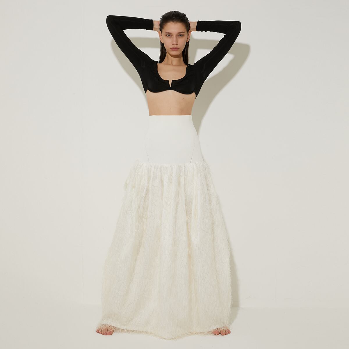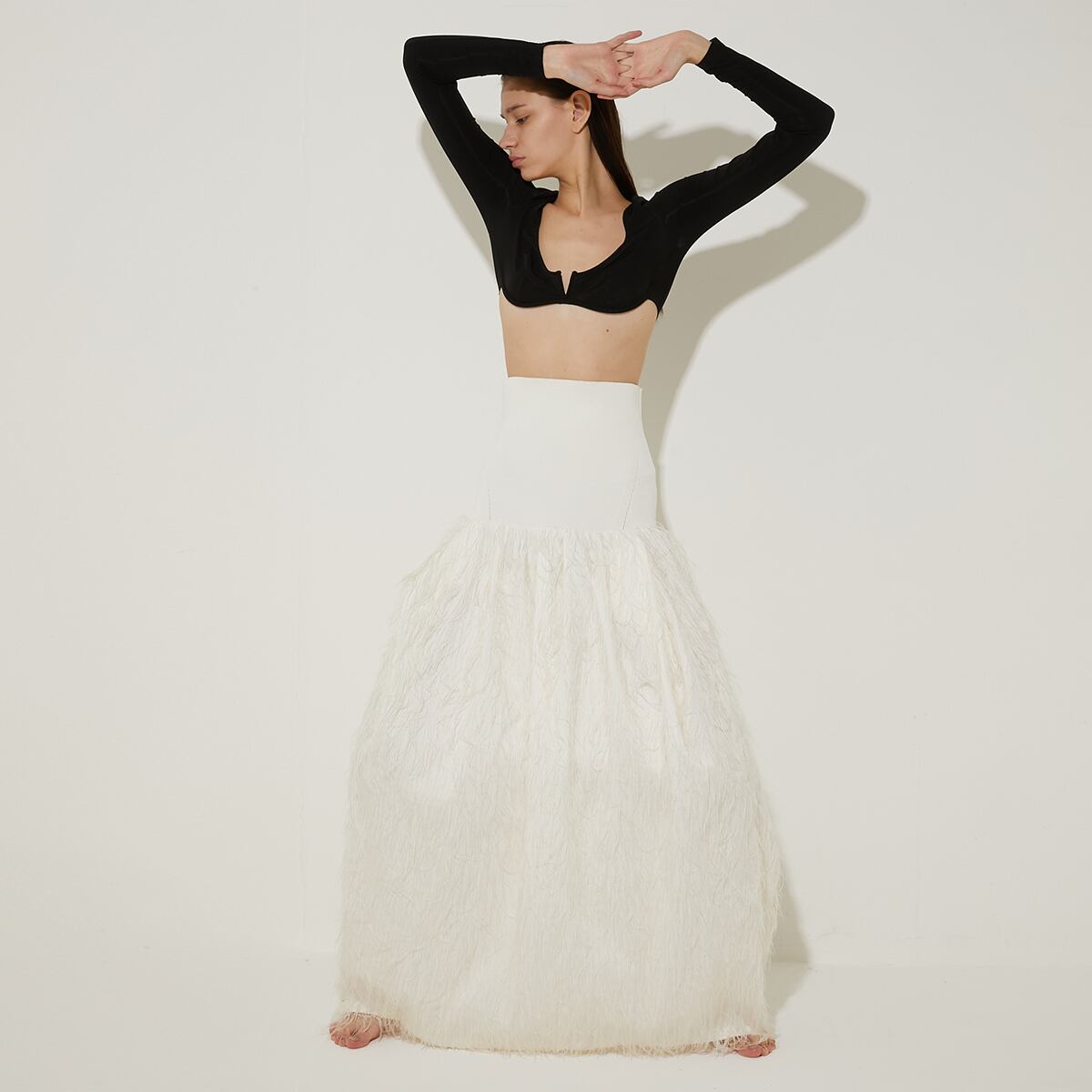 ウエストをリブニットにすることで、ハイウエストスカートとしてもベアワンピースとして着用可能なデザイン。