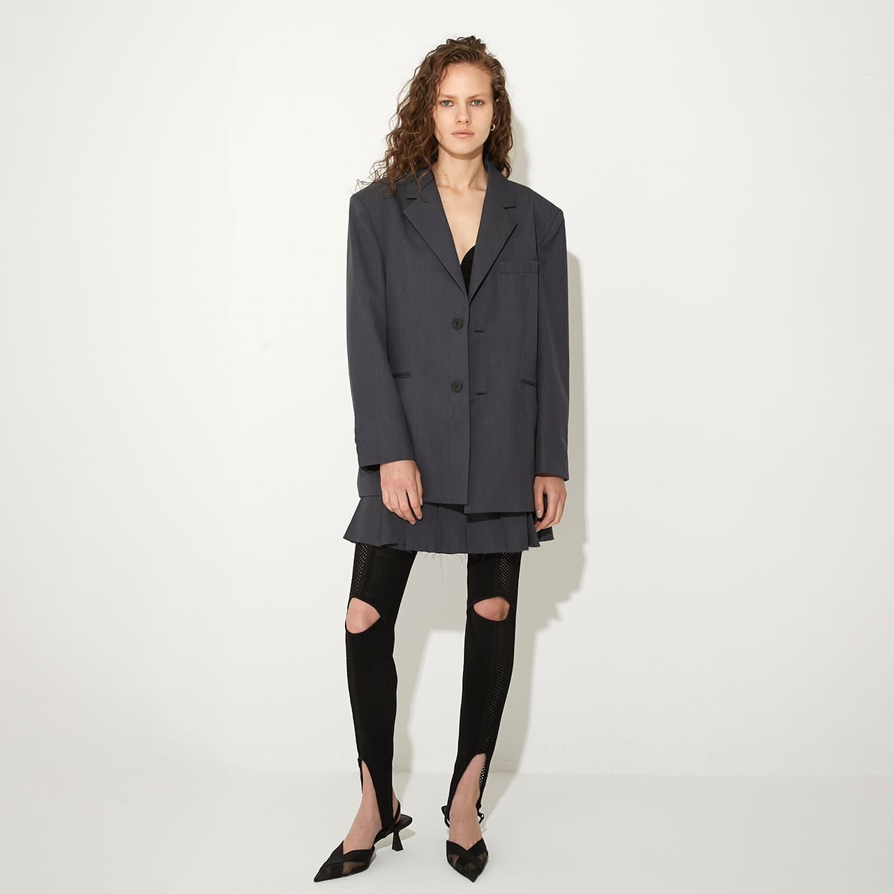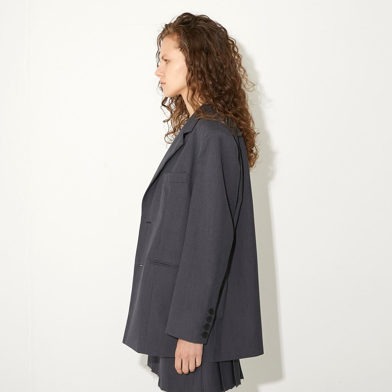 ボクシーなシルエットとしっかりとした肩の仕立てが、シンプルながら印象的な一枚。
