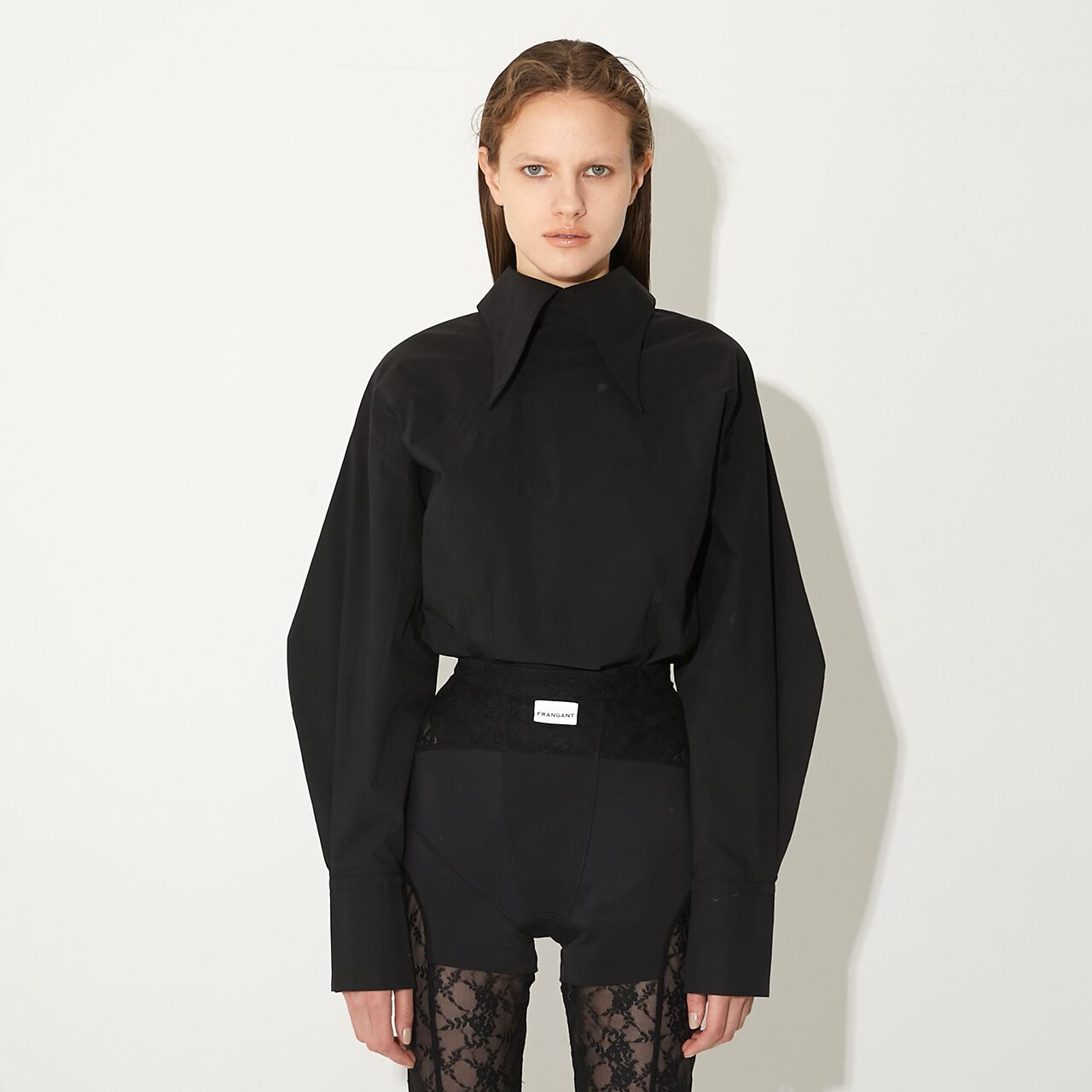クラシカルなフロントデザインに対し、バックスタイルは大きく開いたデザインが対照的なデザイン。
