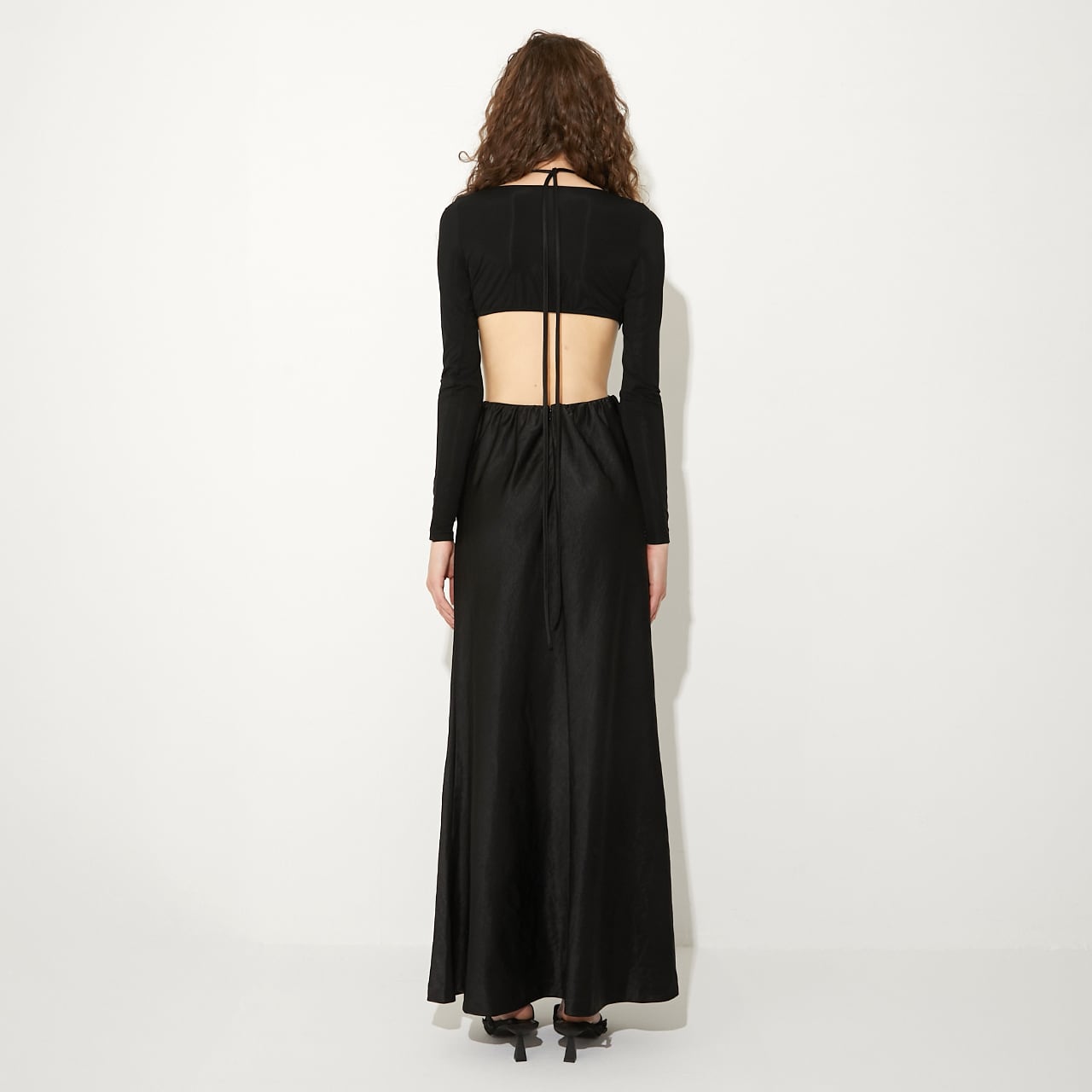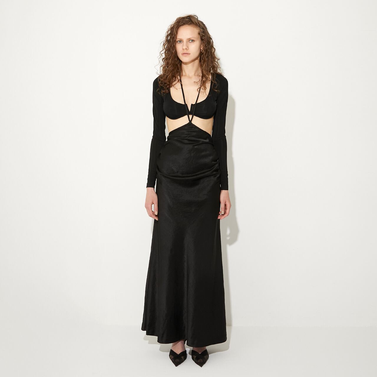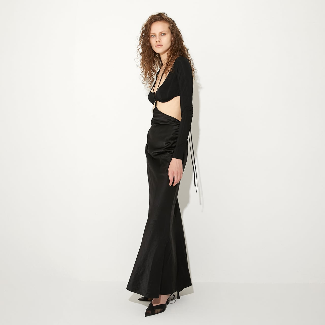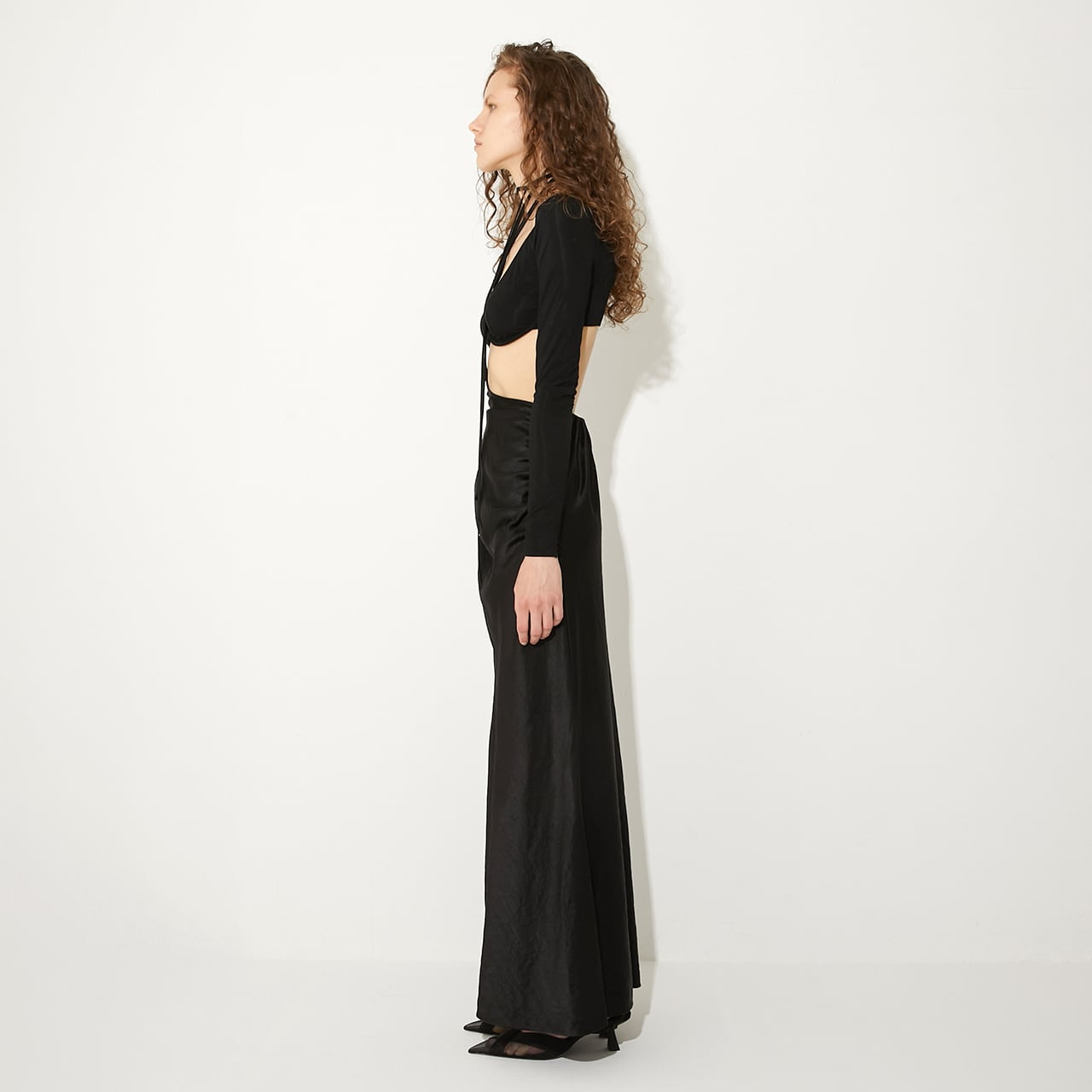 ウエストの高い位置で紐をクロスさせ、自在なアレンジで着用可能。