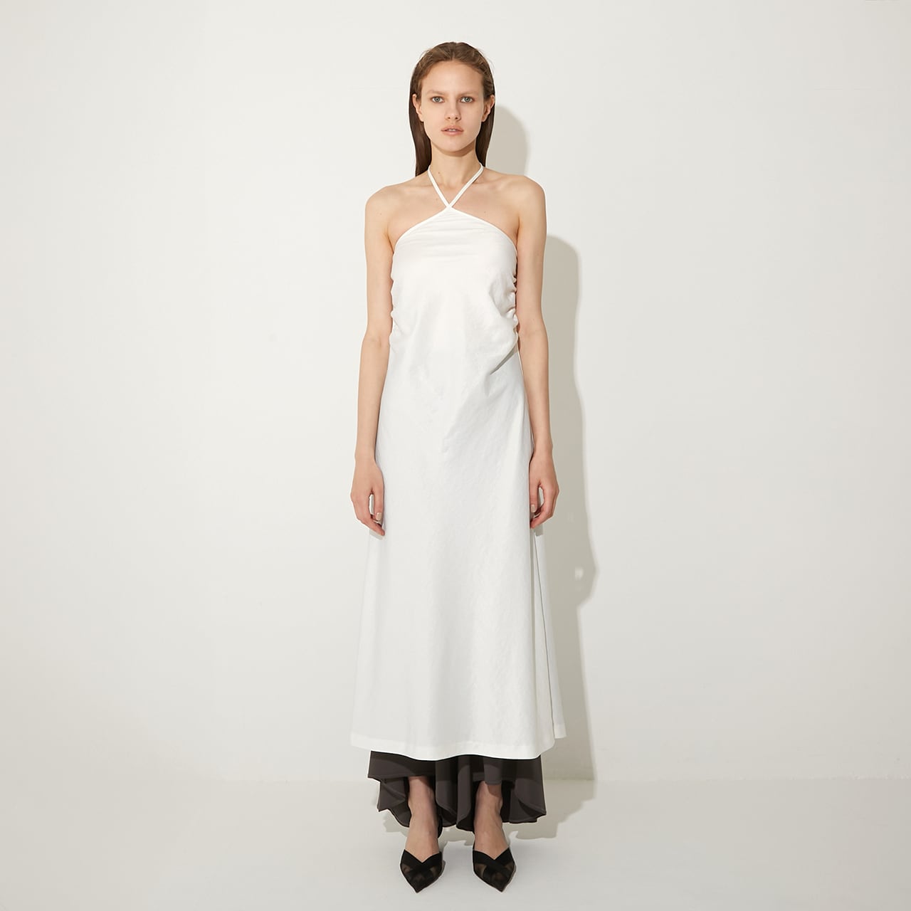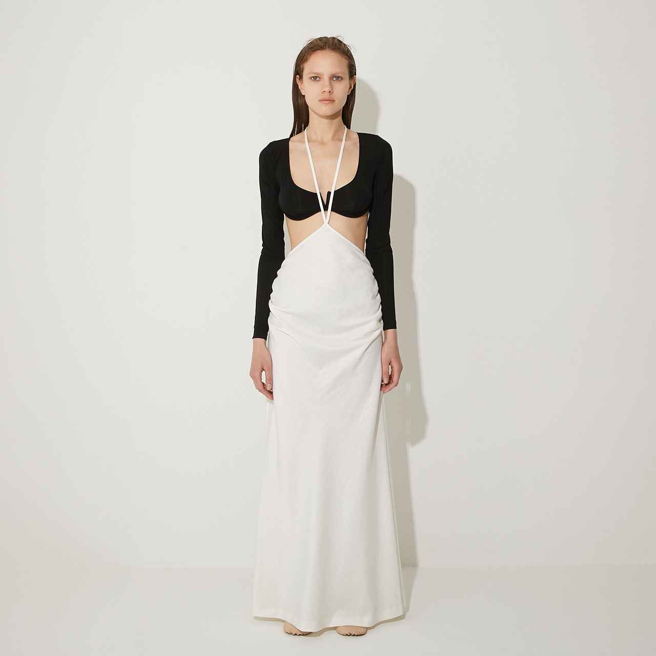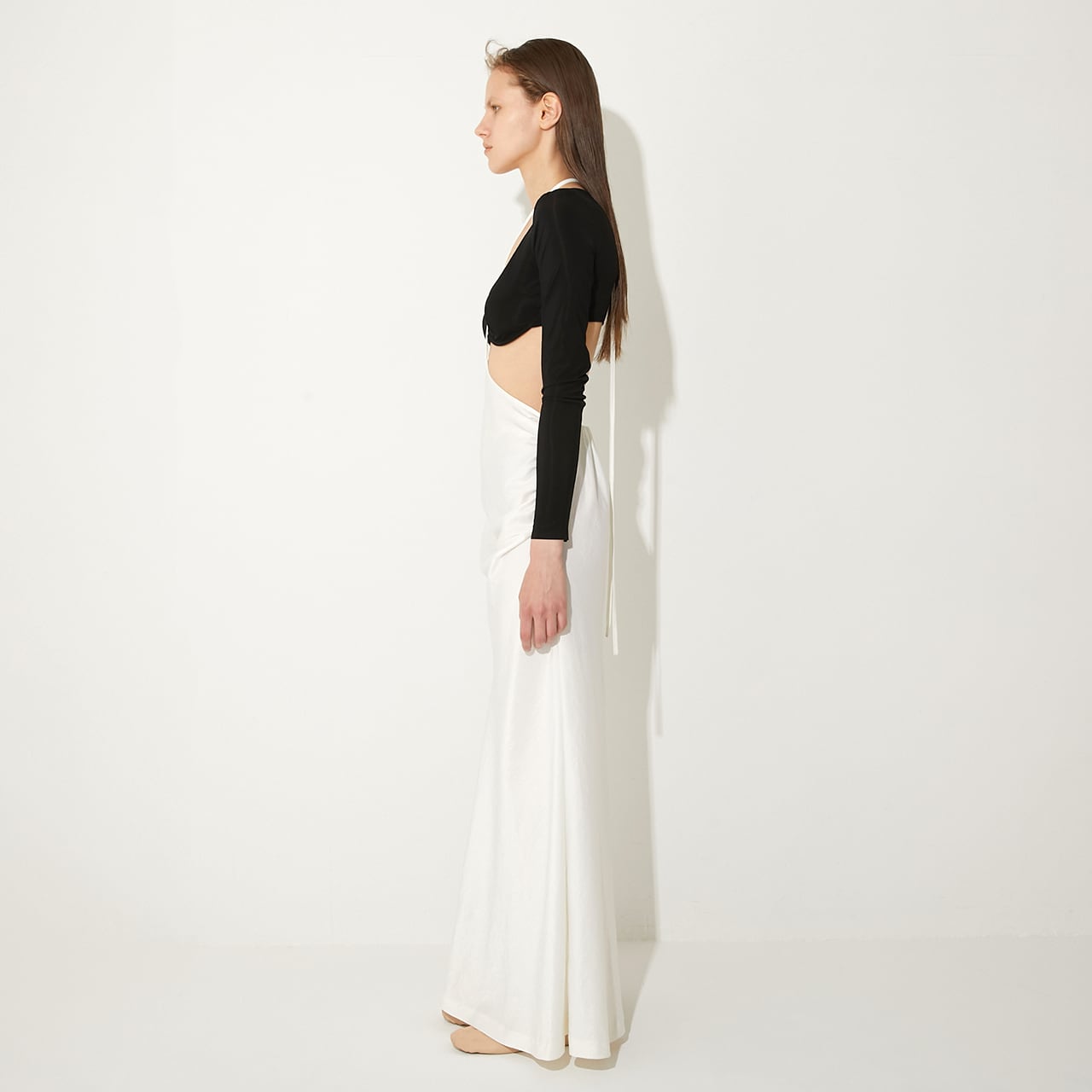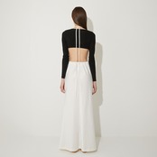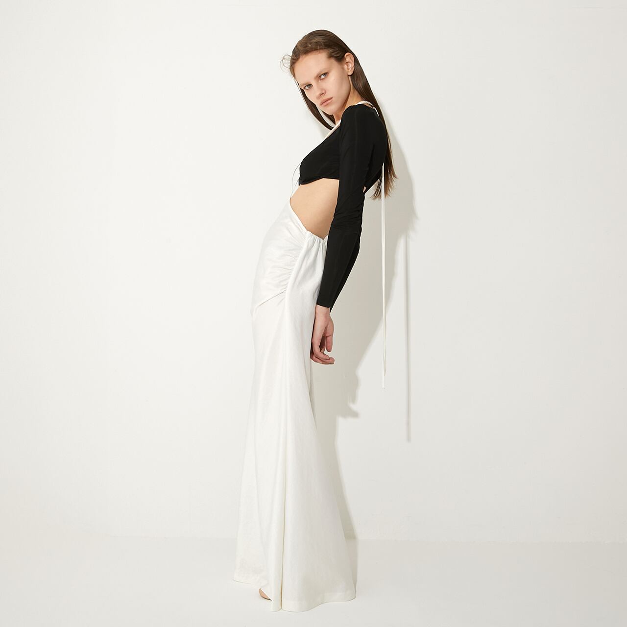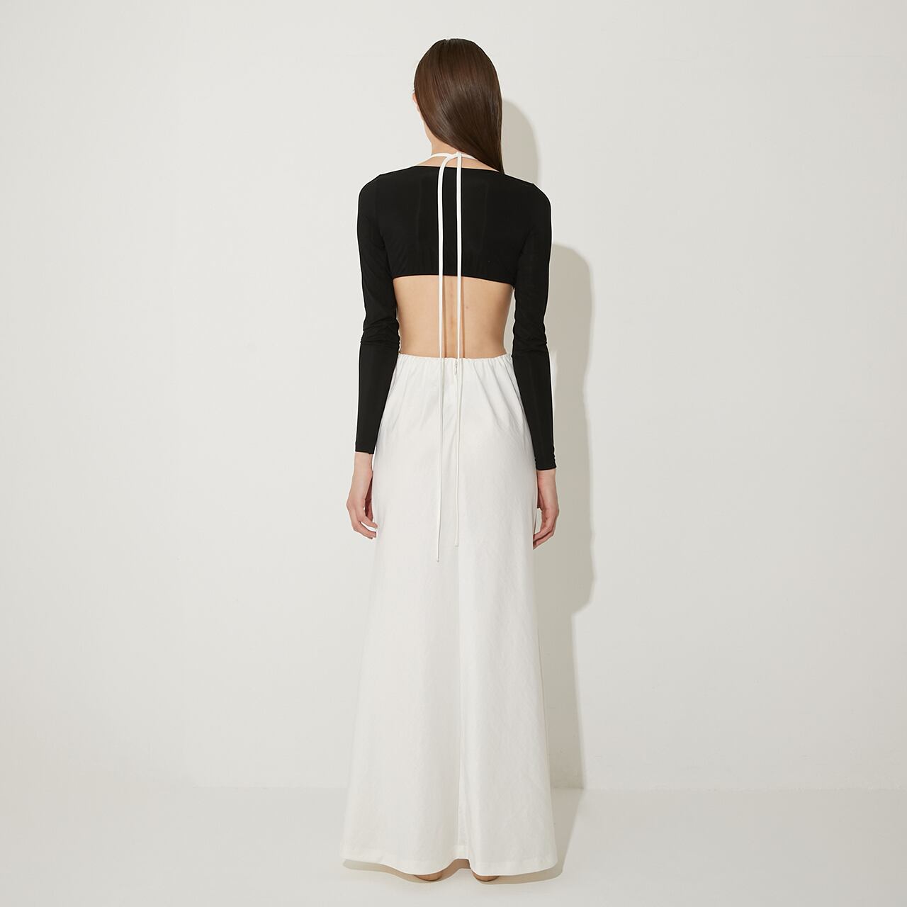 ウエストの高い位置で紐をクロスさせ、自在なアレンジで着用可能。
