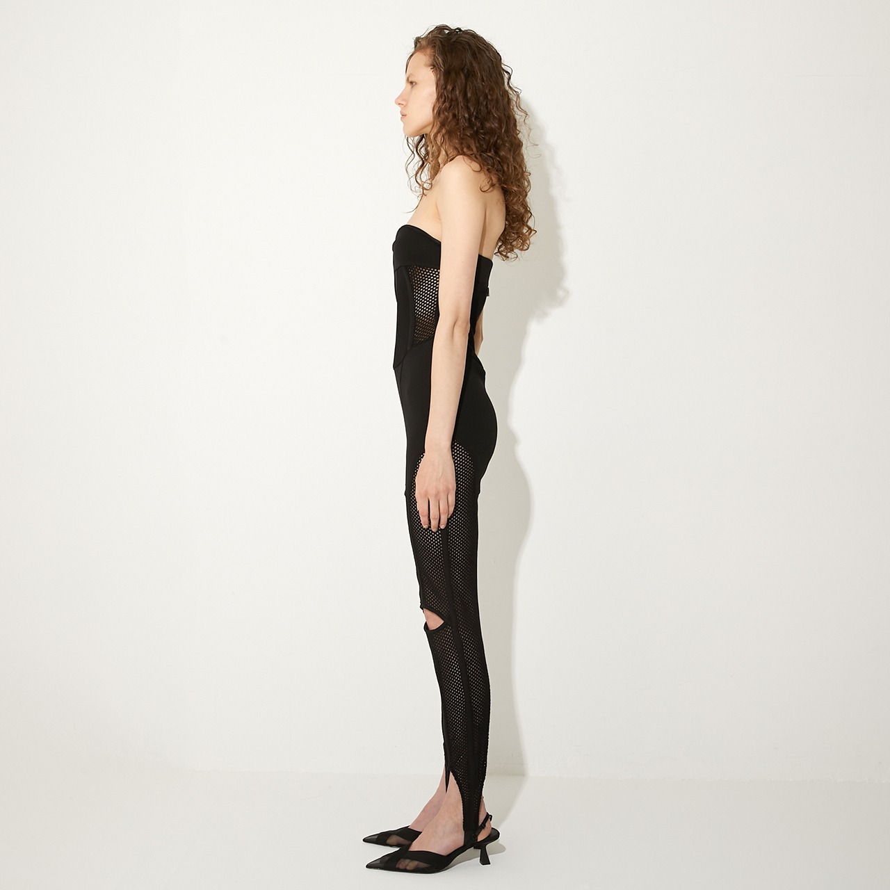 しっかりとした総針編みとメッシュ編みを複雑に組み合わせたニットボディースーツ。